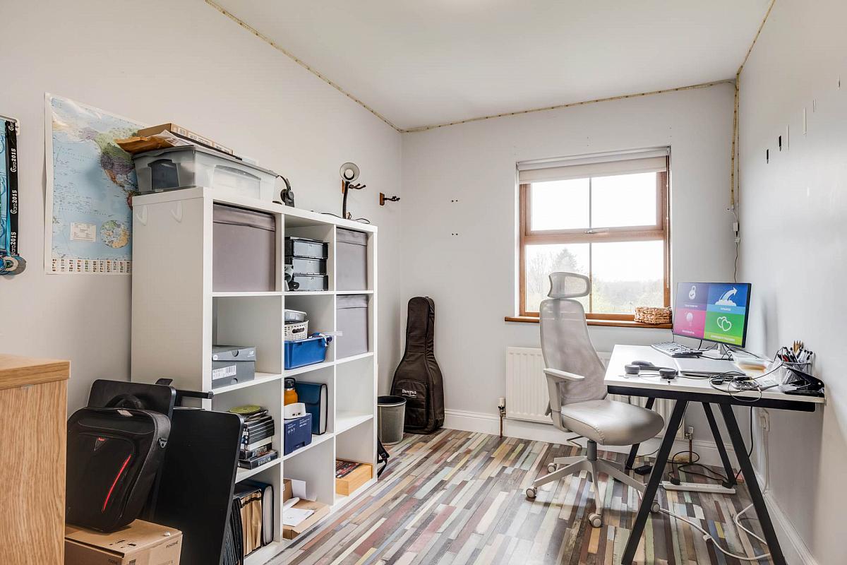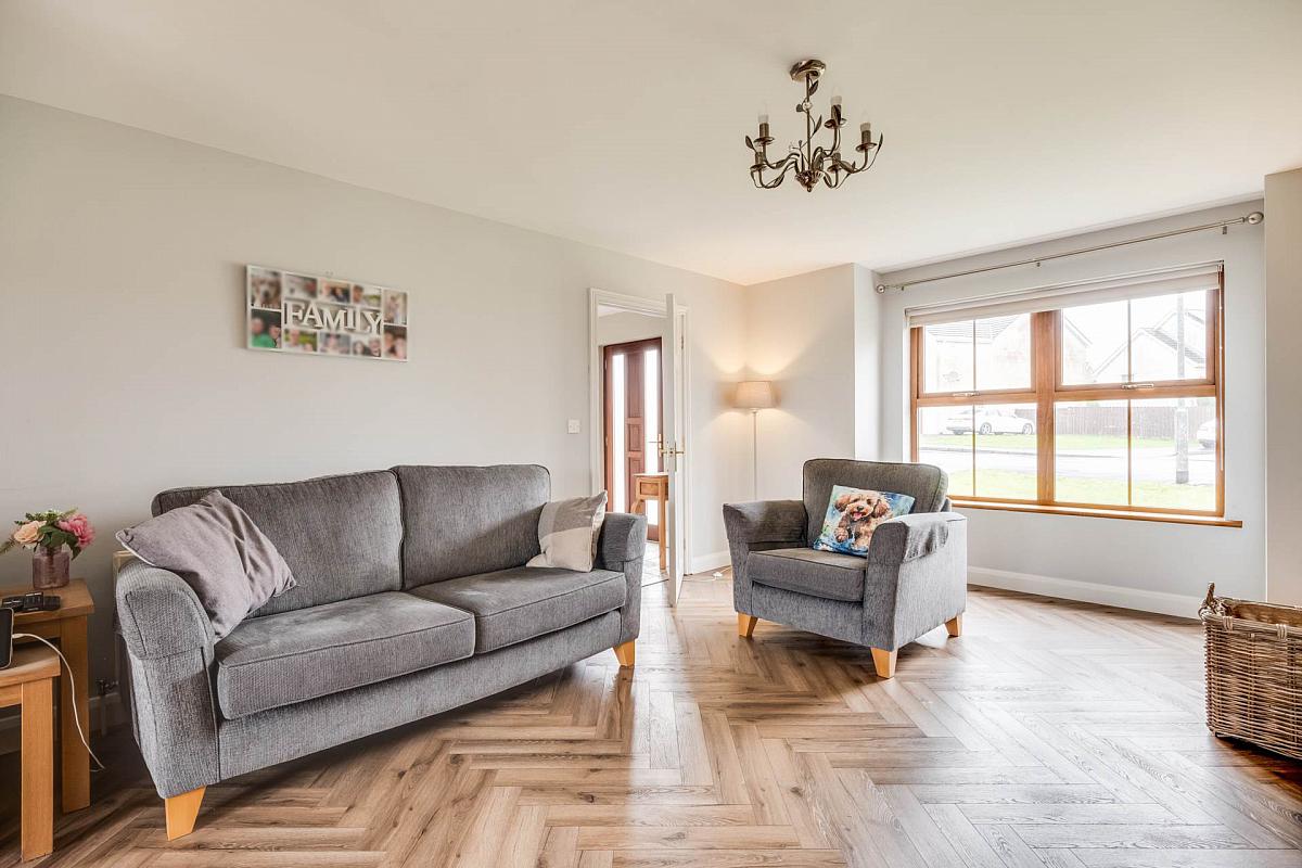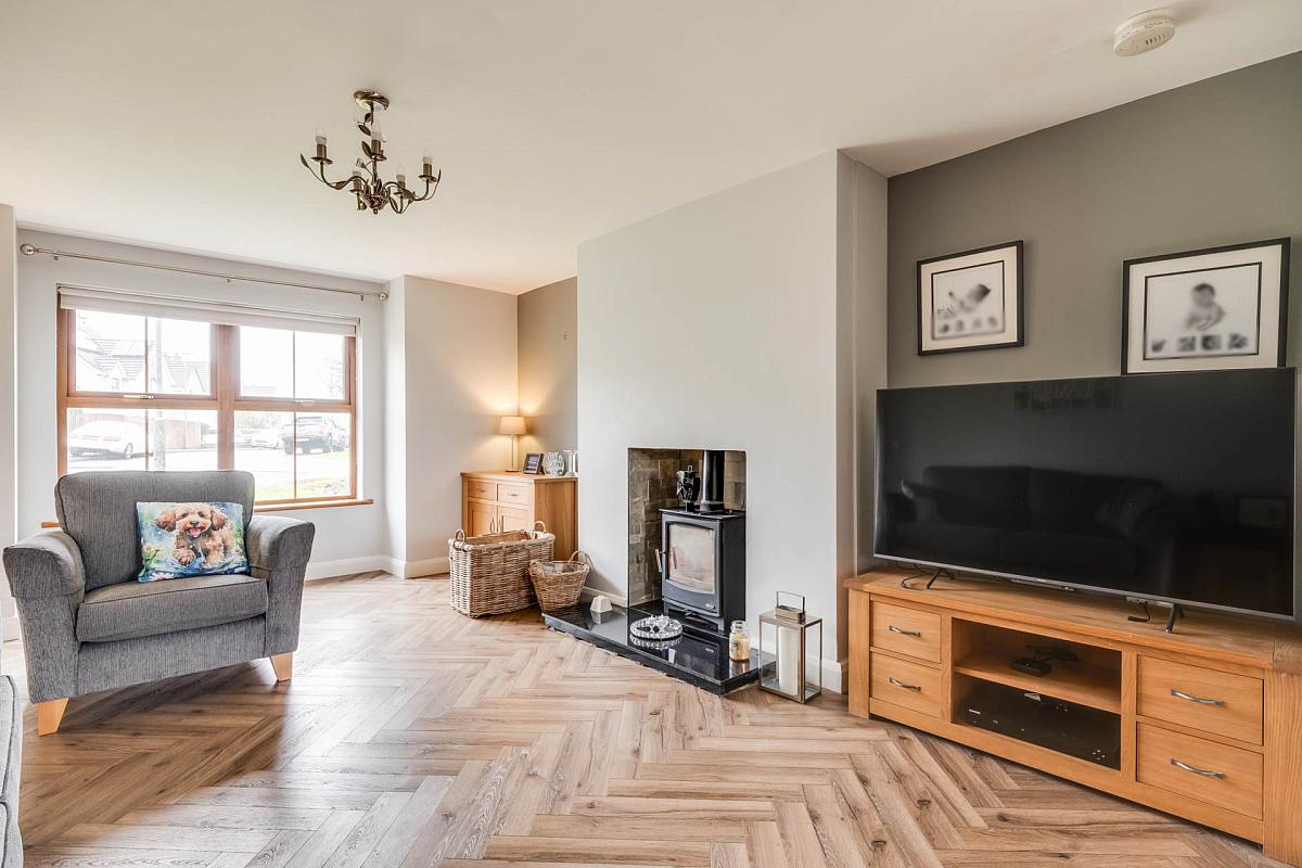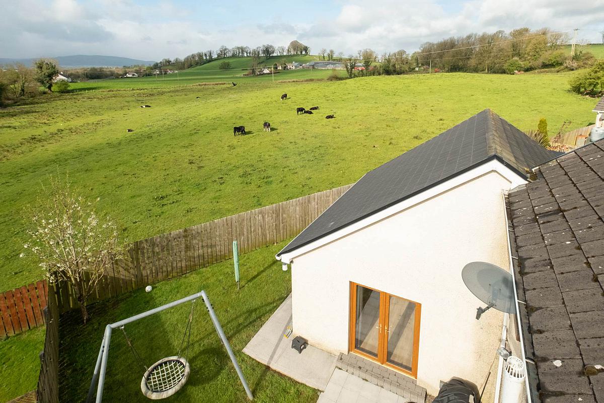 Positioned on a corner site, the property benefits from spacious parking to the front, providing both practicality and ease of access. To the rear, the grounds are thoughtfully laid out to offer an easy to maintain, south facing garden, featuring a paved patio area ideal for outdoor relaxation, alongside a lawn that overlooks farmland to the rear. The garden further enjoys attractive views towards Culciagh Mountain, enhancing the sense of connection to the surrounding landscape and countryside.