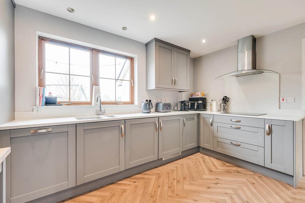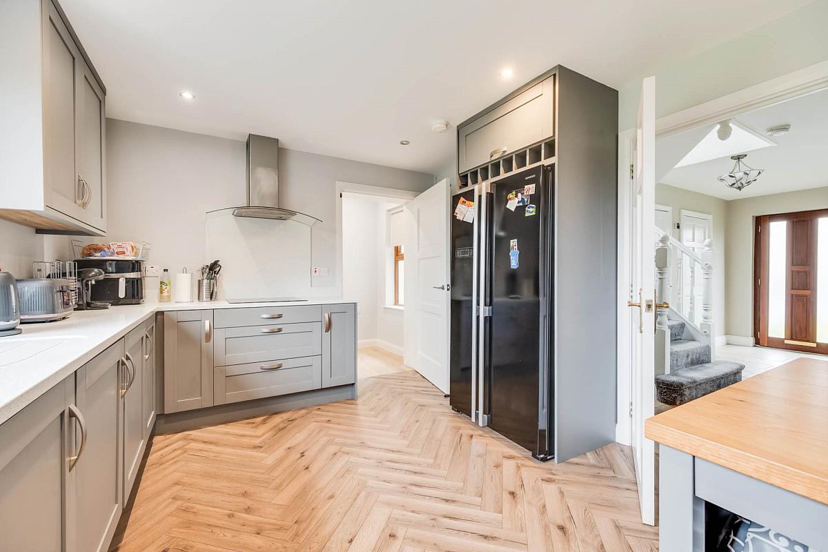 Modern fitted kitchen with a range of high and low level units, integrated hob, eye line double oven & grill, dishwasher, washer dryer, extractor fan hood, plumbed for American fridge freezer, granite work top, granite splash back, wine rack, sink unit with granite drainer, parquet style flooring, recessed lighting, double patio doors.