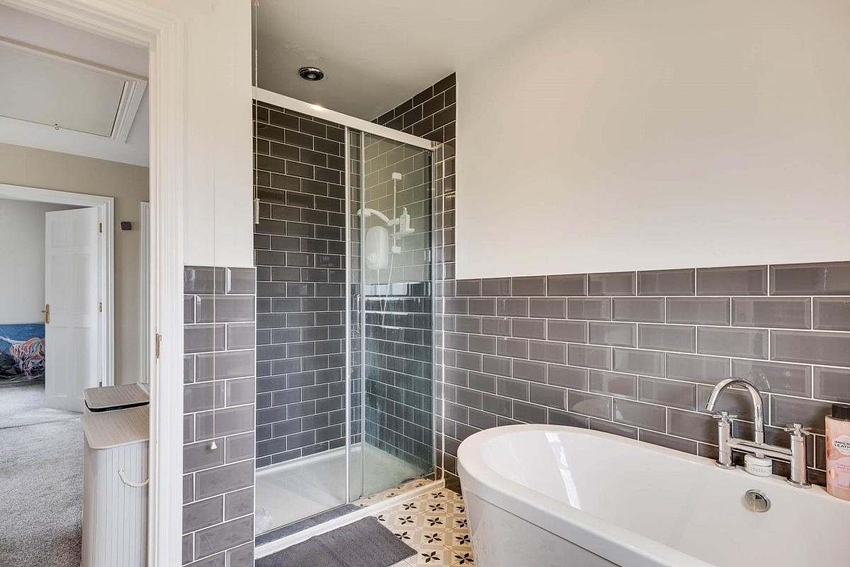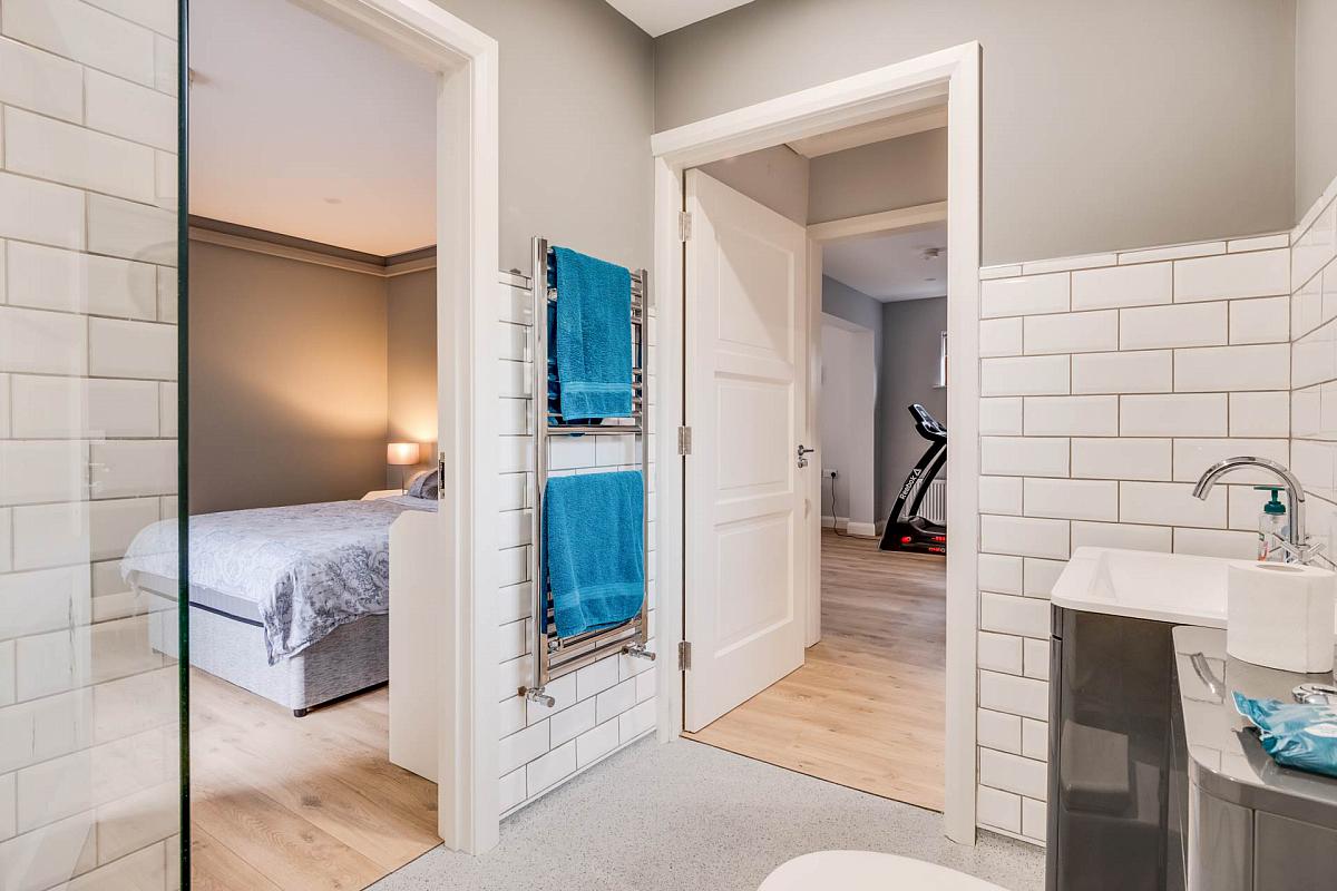 Contemporary suite, wet room shower with electric shower, glazed shower screen, tiled walls, vanity unit, heated towel rail, recessed sensor lighting.