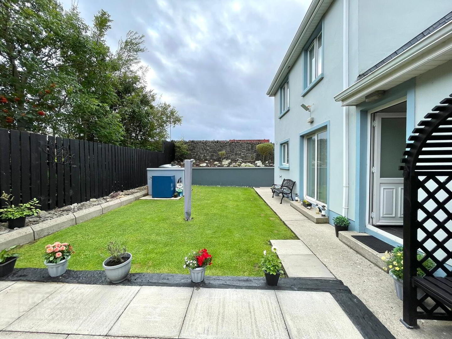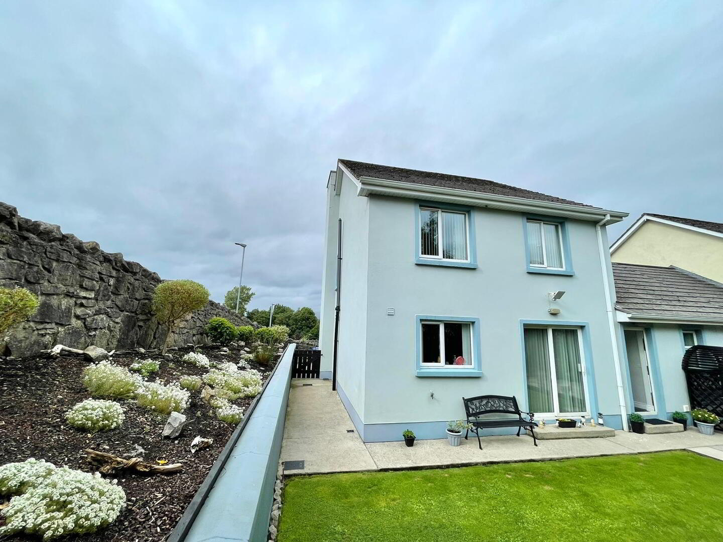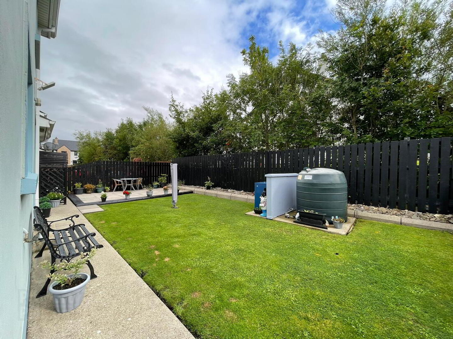 Exceptionally attractive garden with patio area, extensive raised rockery.
