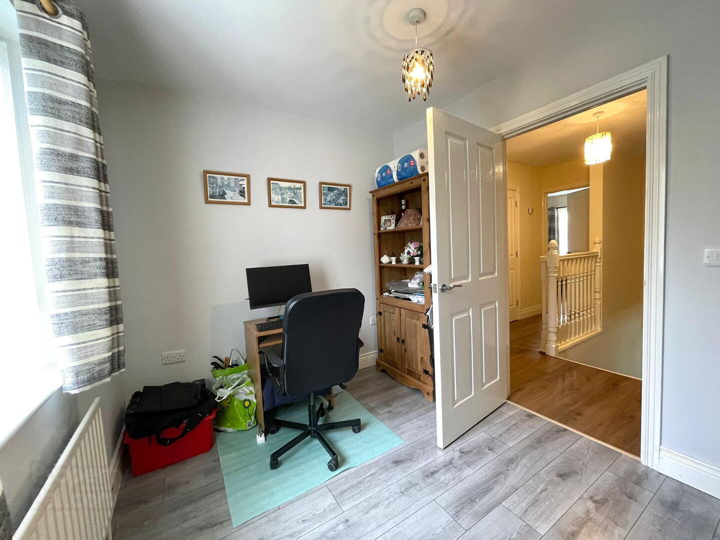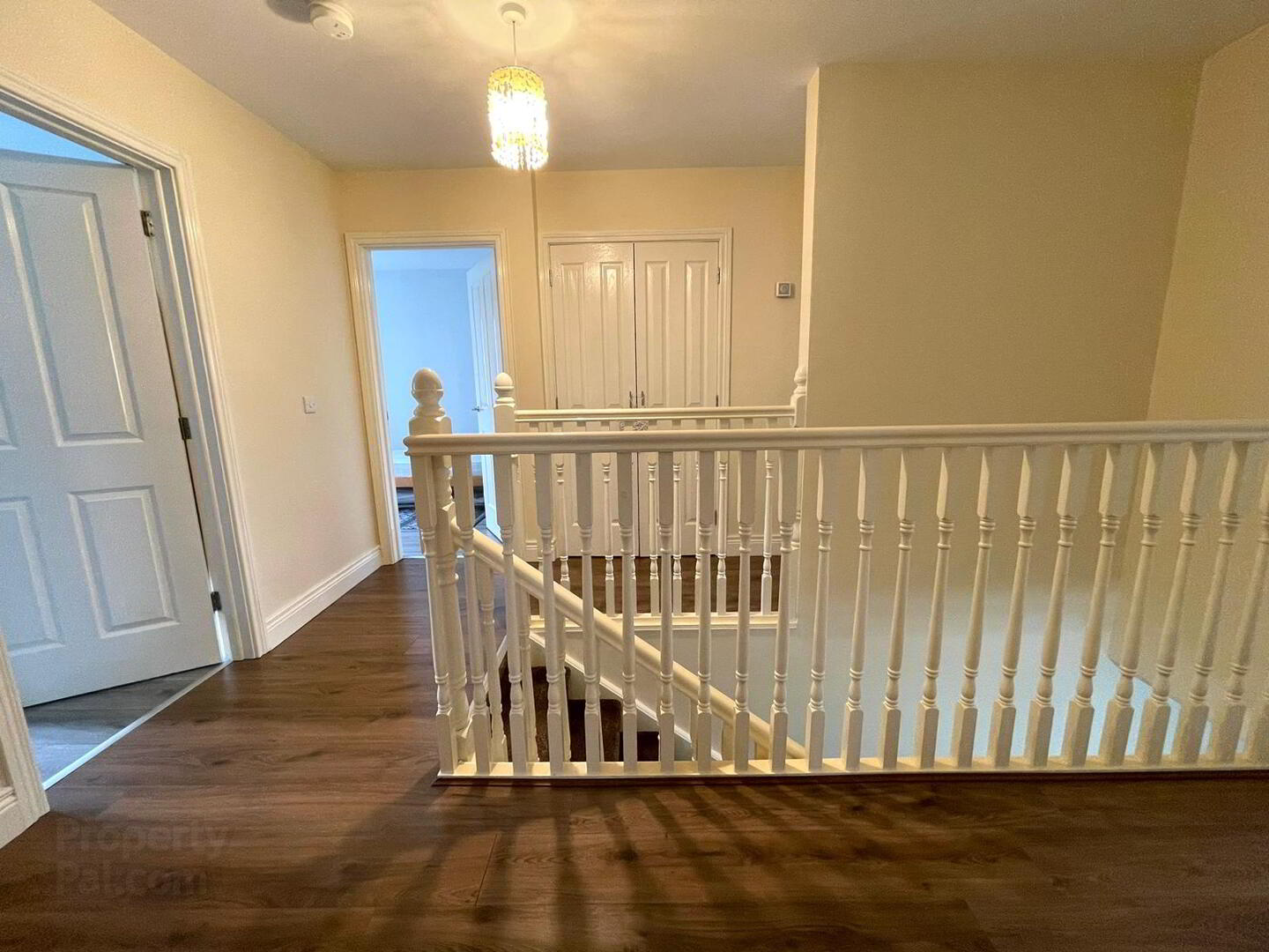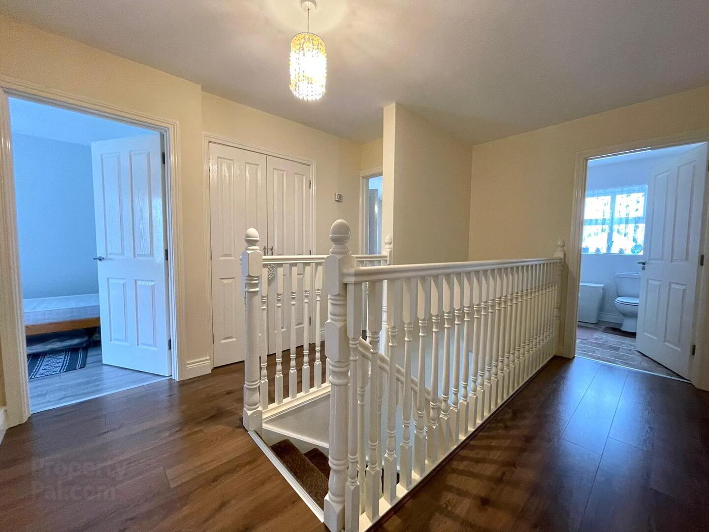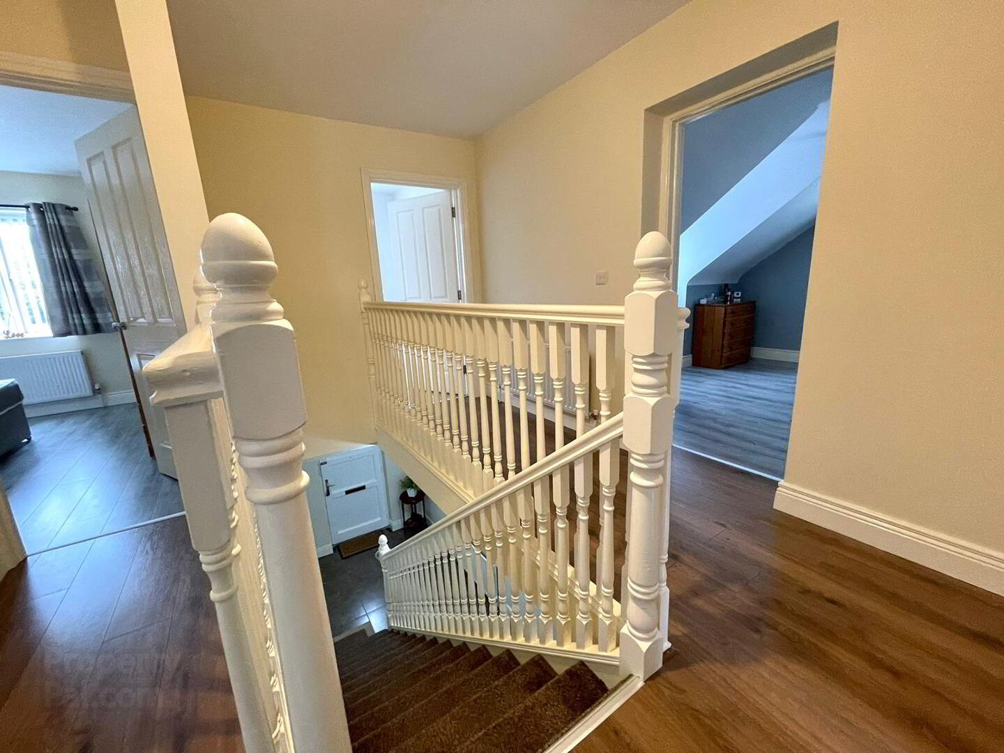 Carpet on the stairwell, wooden floor laid on the spacious landing, shelved hot press.