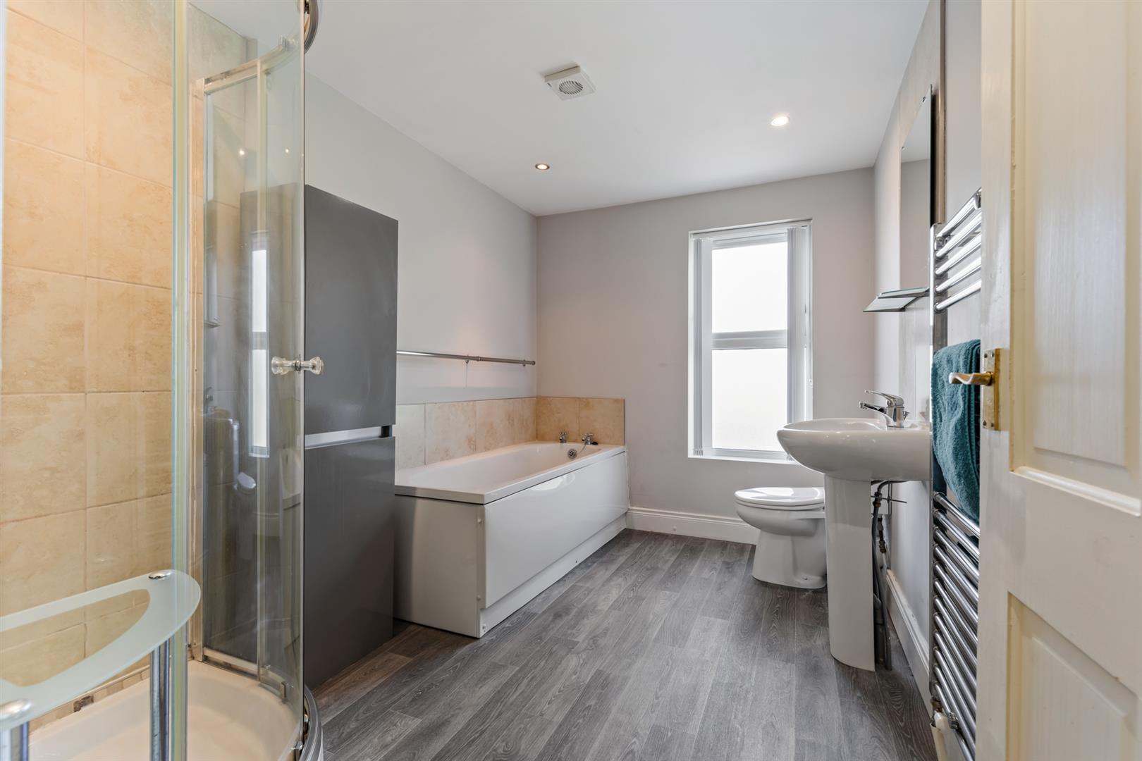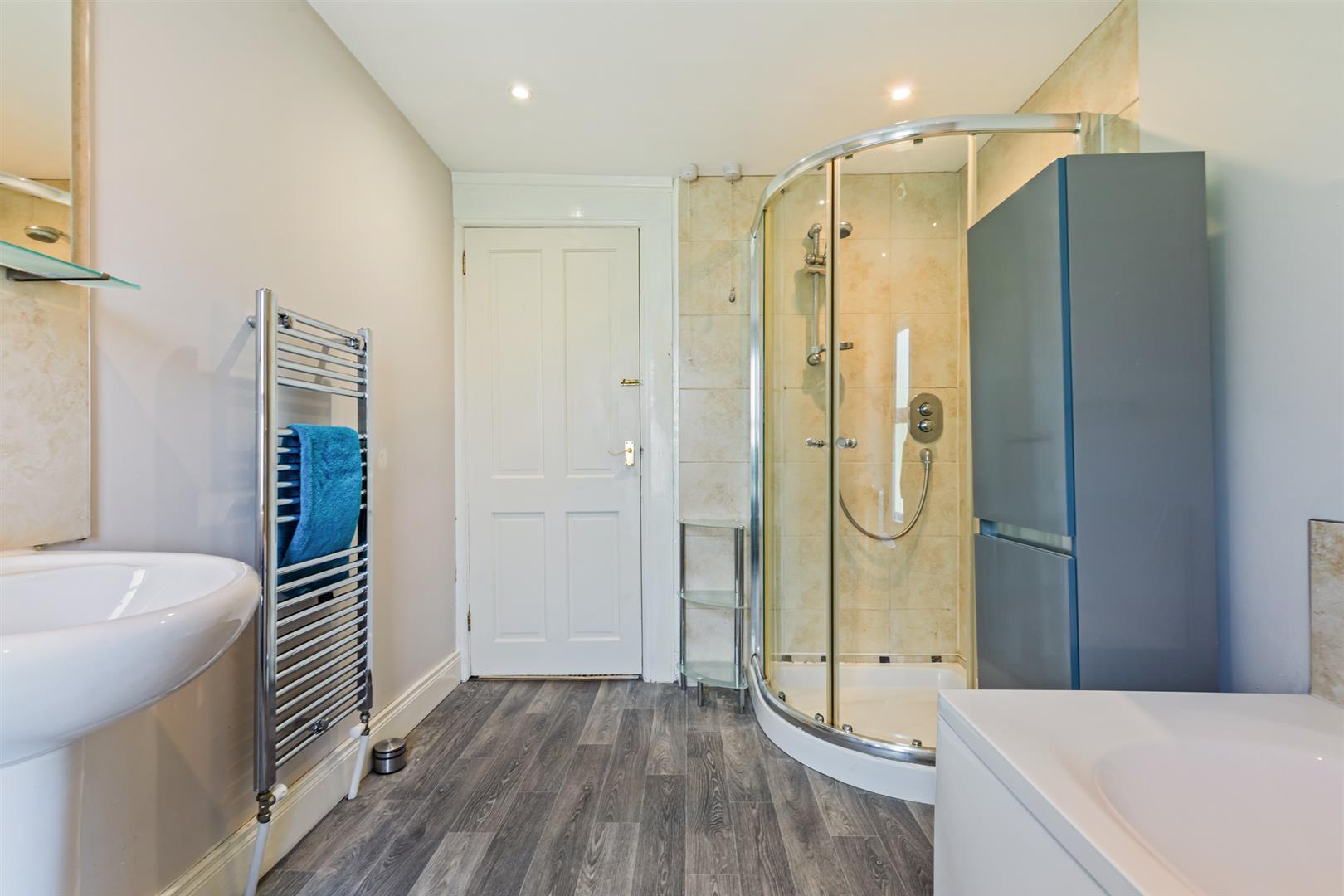 Modern white suite comprising: Panelled bath with tiled splashback, walk in shower cubicle with built in shower, tiled walls and sliding shower doors. Pedestal wash hand basin with mixer tap and tiled splashback, low flush WC, recessed spotlighitng, extractor fan.