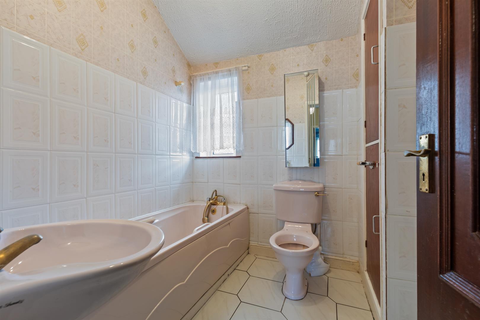 Coloured suite comprising: panelled bath with mixer tap and telephone hand shower, pedestal wash hand basin, low flush W/C, part tiled walls, tiled flooring, cupboard with gas fired boiler.