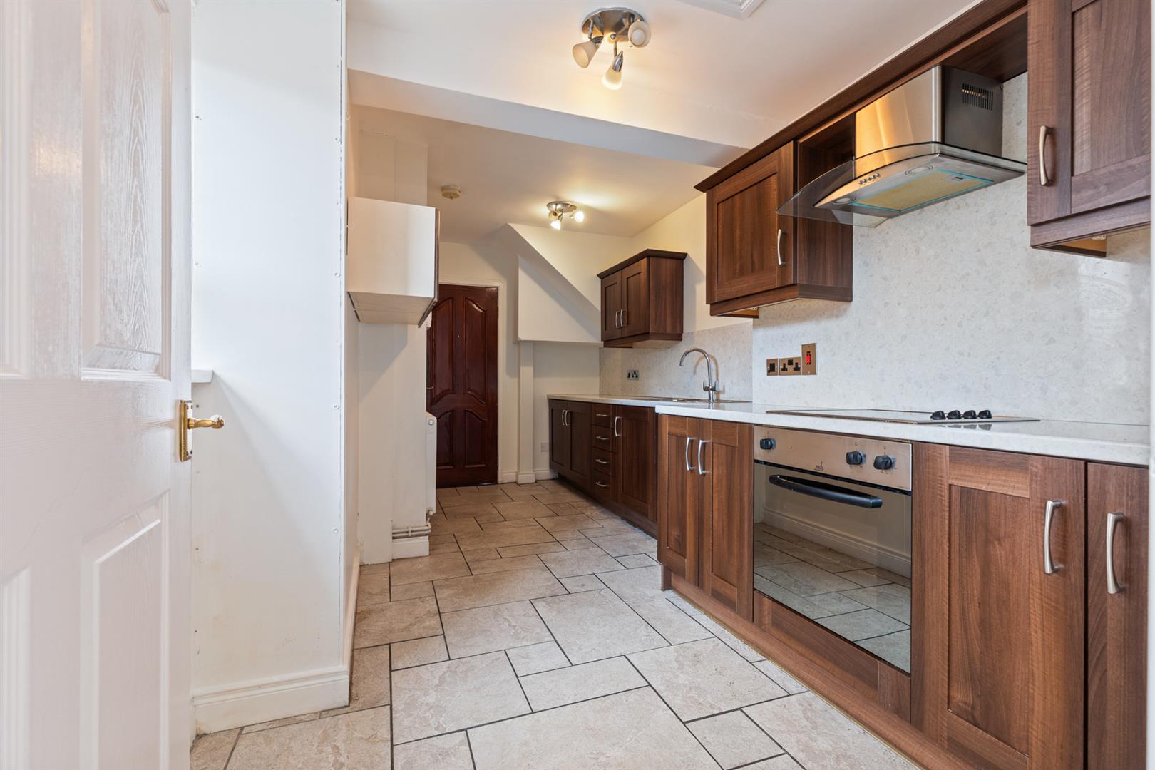 Extensive range of high and low level units, Formica work surfaces, inset 1 1/4 basin single drainer stainless steel sink unit with mixer tap, built in under oven, ceramic hob, stainless steel extractor hood, plumbed for washing machine, part PVC wall cladding, ceramic tiled flooring.