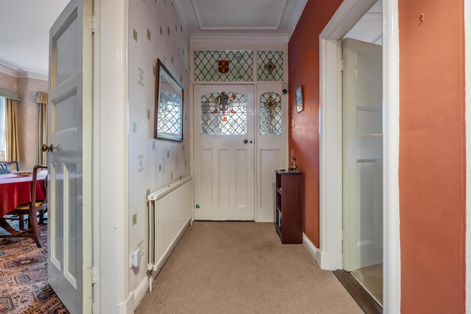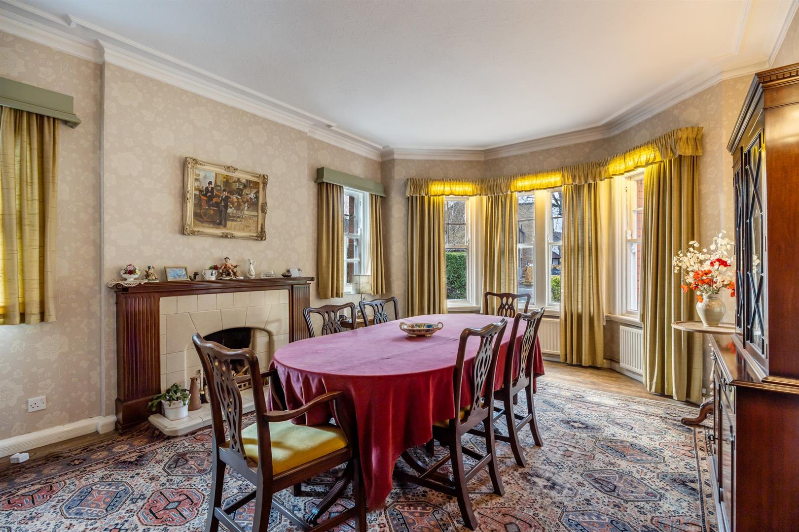 The accommodation begins with an entrance porch leading into a welcoming reception hall with tiled flooring and a striking stained glass window, setting the tone for the craftsmanship found throughout. A cloakroom with storage and wash hand basin and a separate WC add practicality. The principal reception rooms are both elegant and spacious, featuring attractive fireplaces, bay windows, cornice detailing and, in one room, an impressive coffered ceiling. Original hardwood flooring enhances the dining room, while the living room and additional reception space provide flexibility for modern family living.