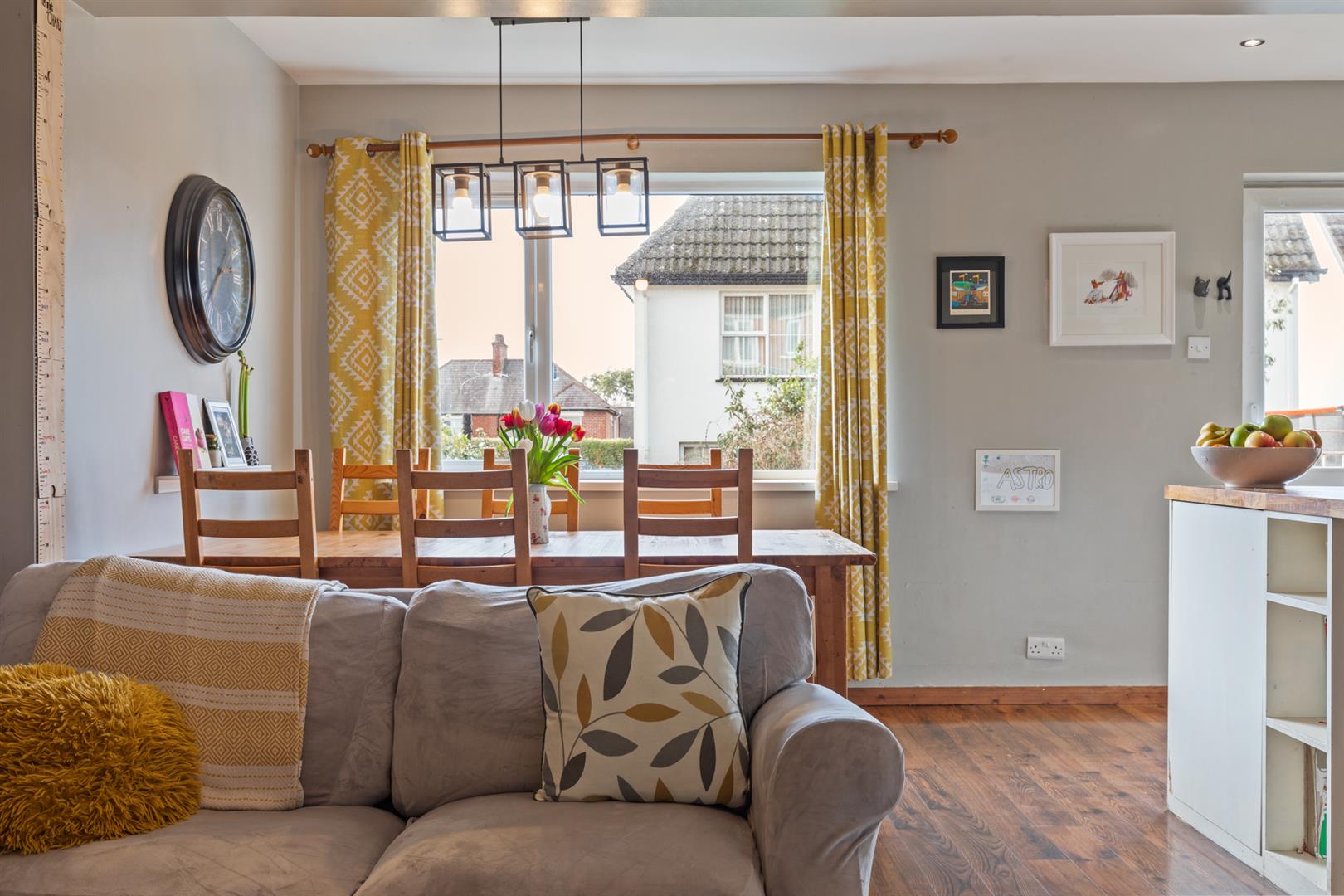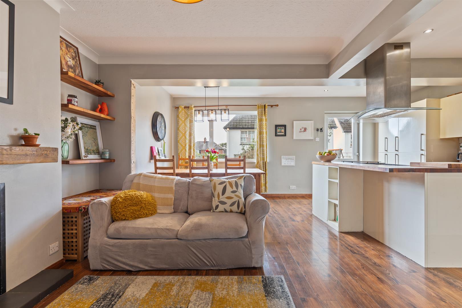 Laminate wood flooring, cast iron stove with slate hearth, picture rail, cornice ceiling.