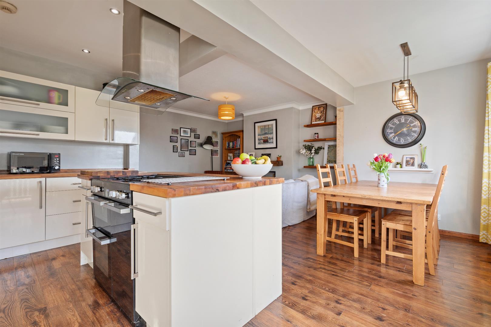 The entrance hall has solid wood flooring, storage under the stairs, a cloaks cupboard, and a ground floor WC. The front lounge is light and inviting, with a bay window, cast iron stove on a slate hearth, picture rail, and corniced ceiling. At the rear, the open plan living, kitchen, and dining area features modern units with wood block work surfaces, a central island with space for a range cooker, integrated appliances, and recessed lighting.