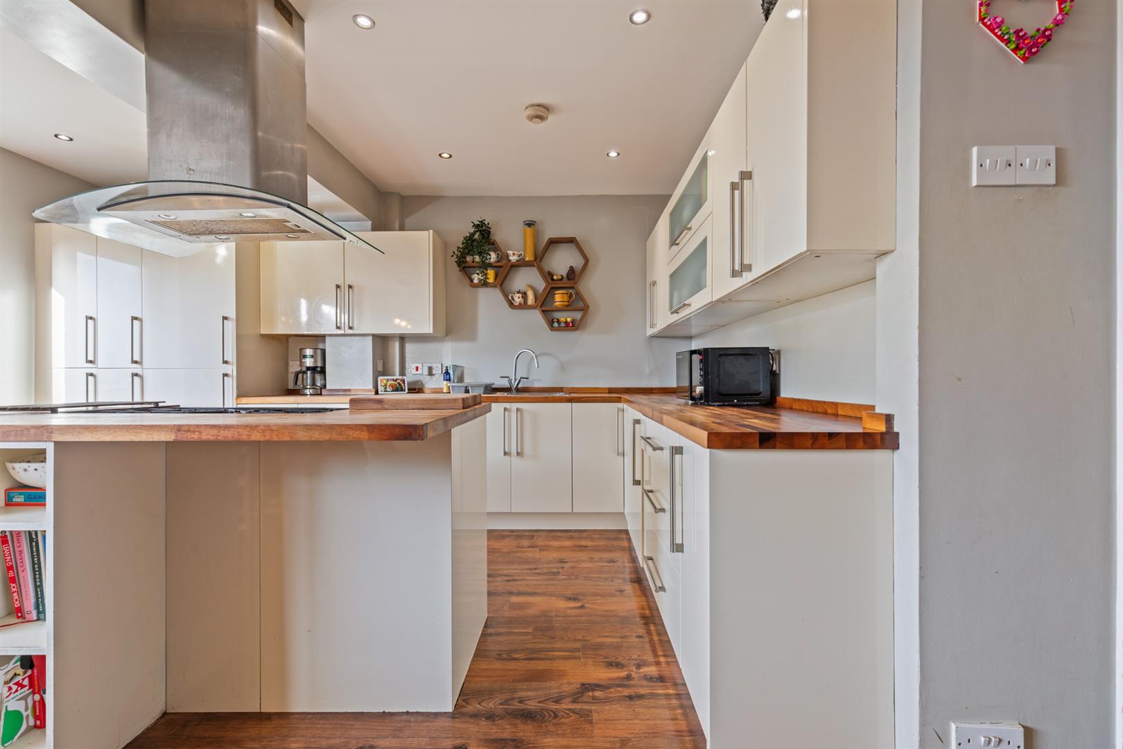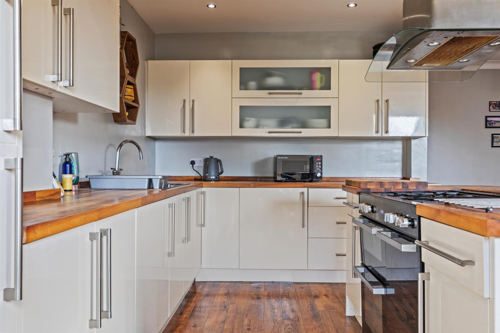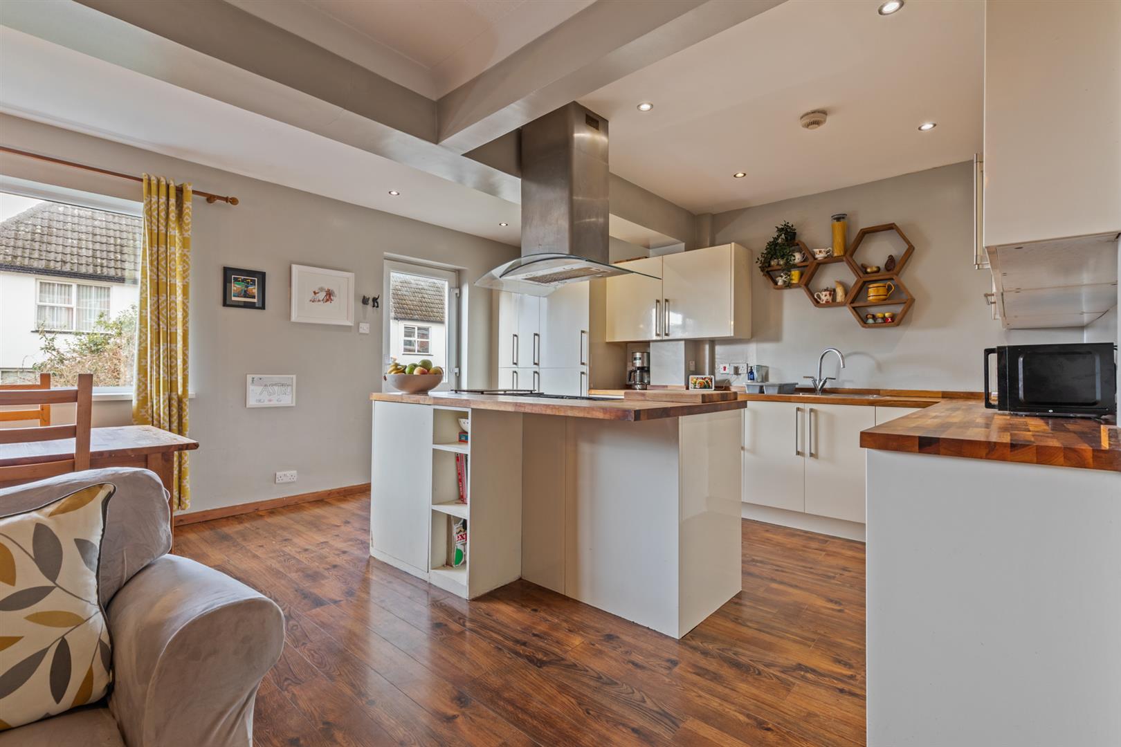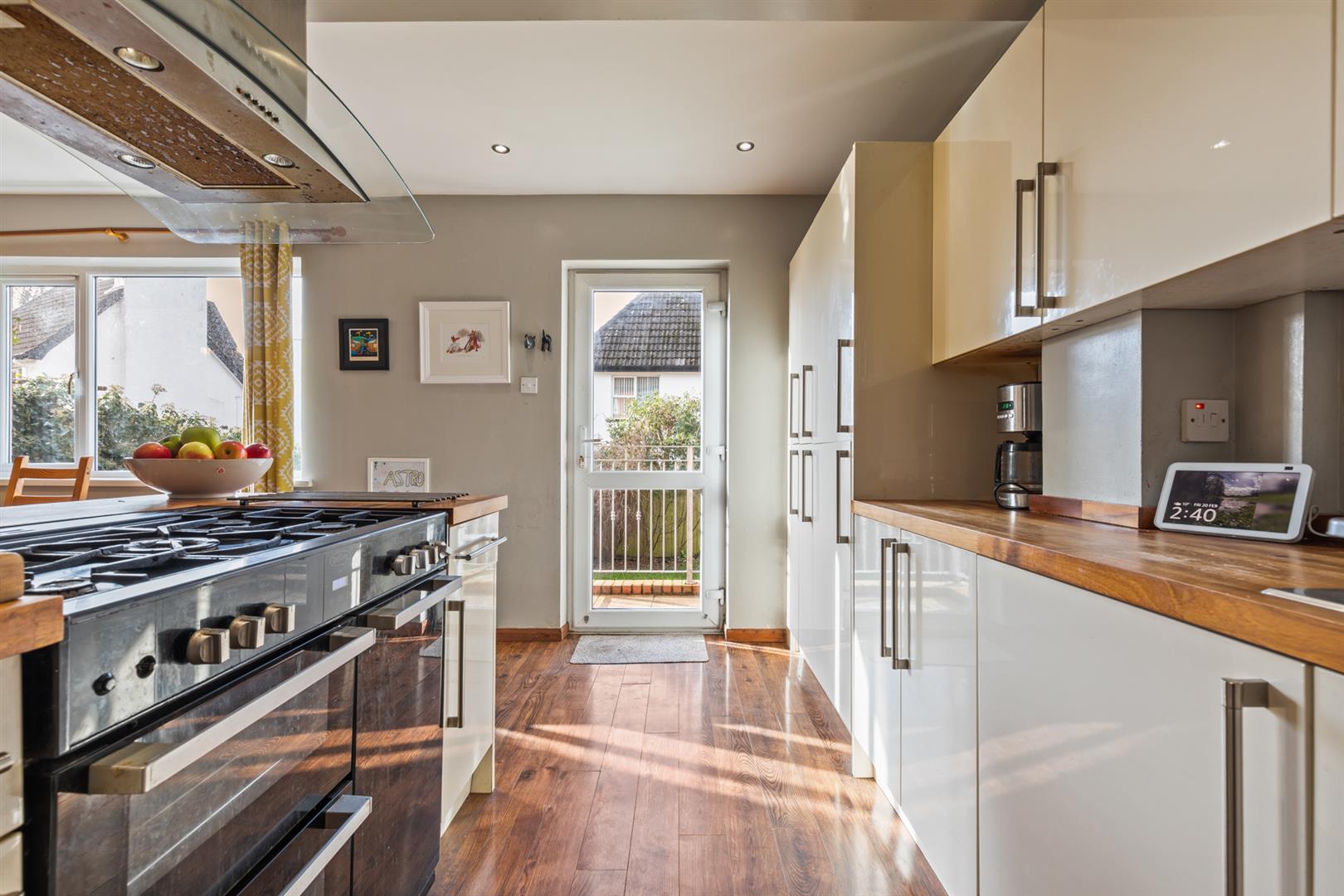 Excellent range of modern high and low level units with wood block work surfaces and upstand, single drainer stainless steel sink unit with mixer tap. Centre island with space for range cooker. Integrated fridge/freezer and washing machine, recessed spotlighting, laminate wood flooring.