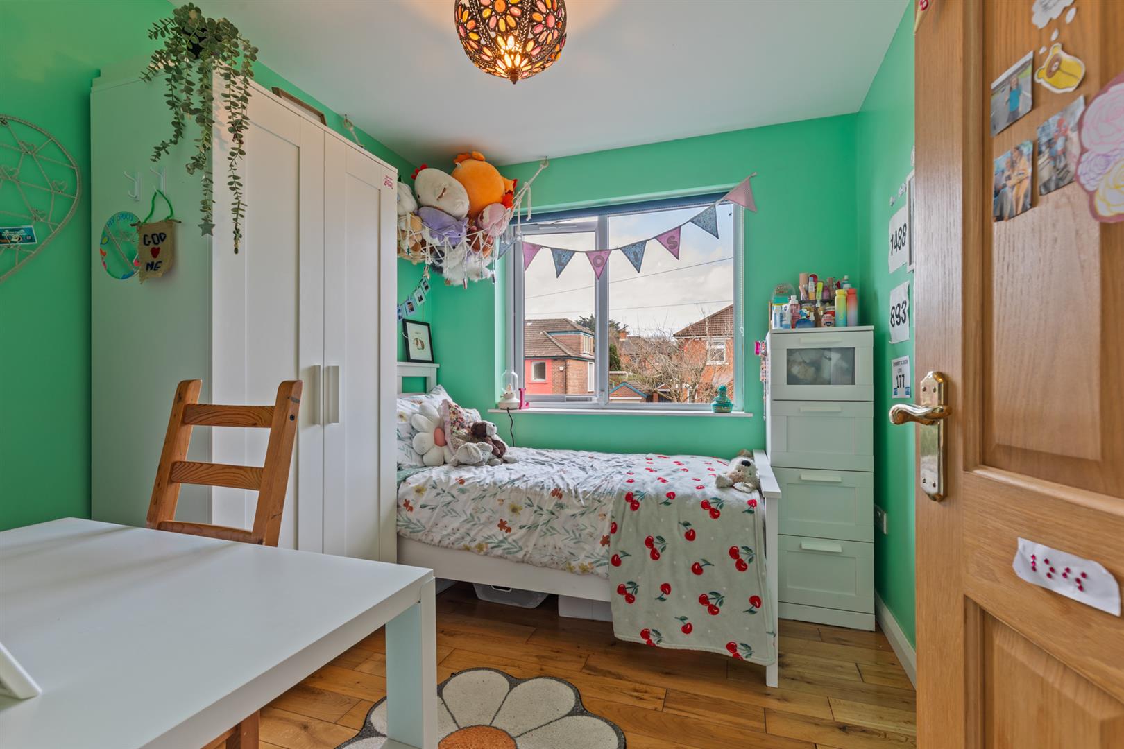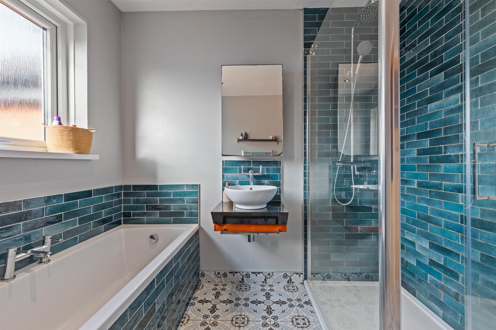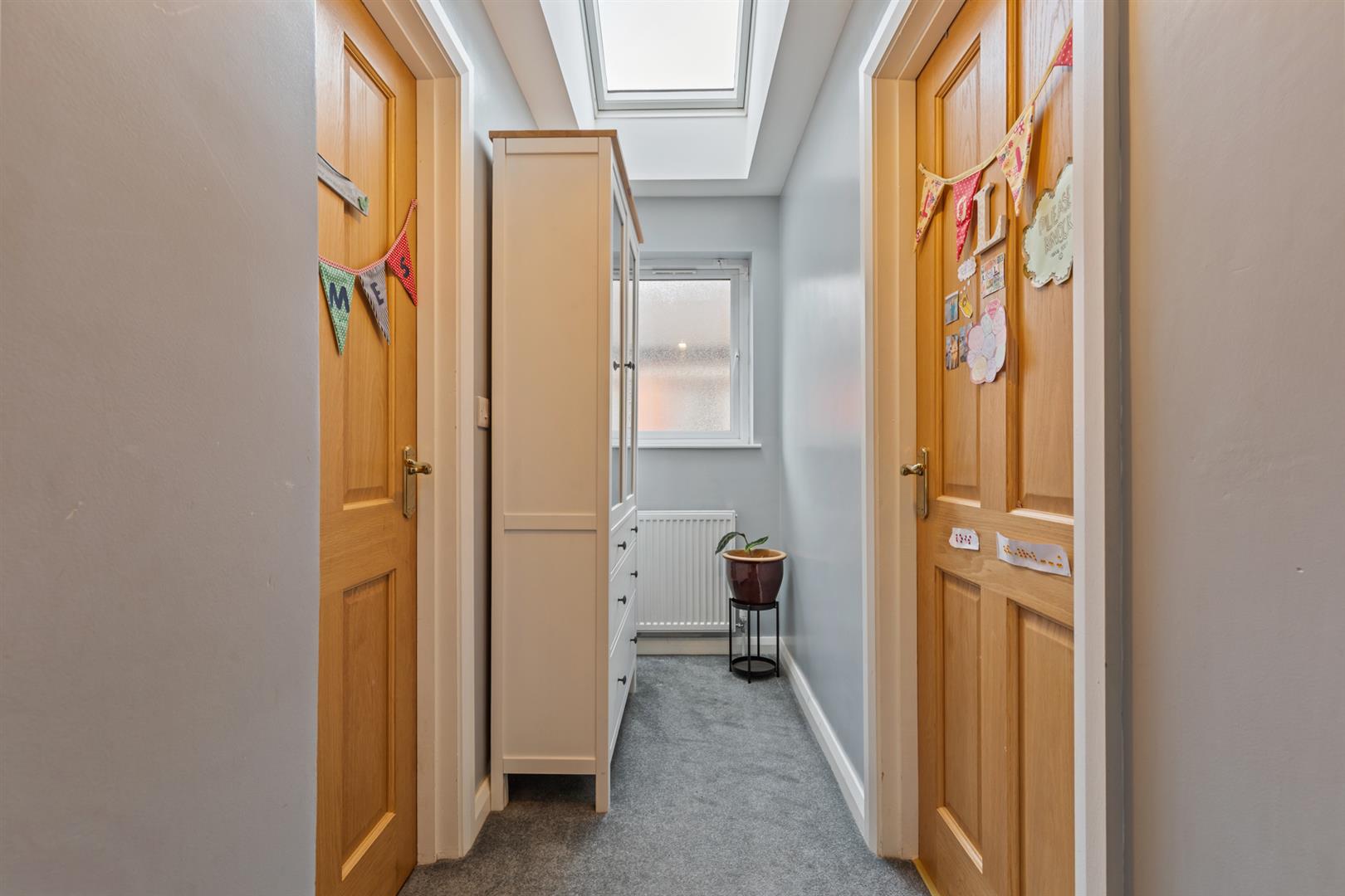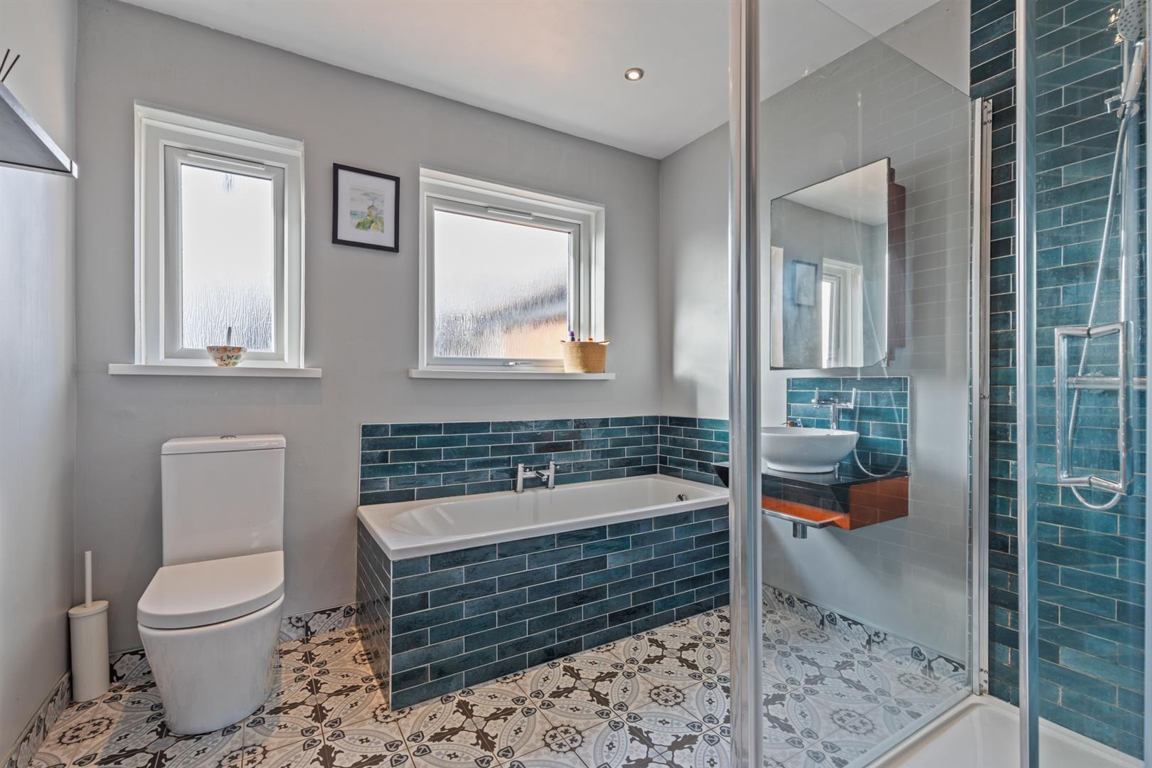 Upstairs are five well proportioned bedrooms, including two from the extension. The bathroom includes a bath, walk-in shower with rainfall fitting, WC, and wash basin, with part tiled walls and a fully tiled floor.