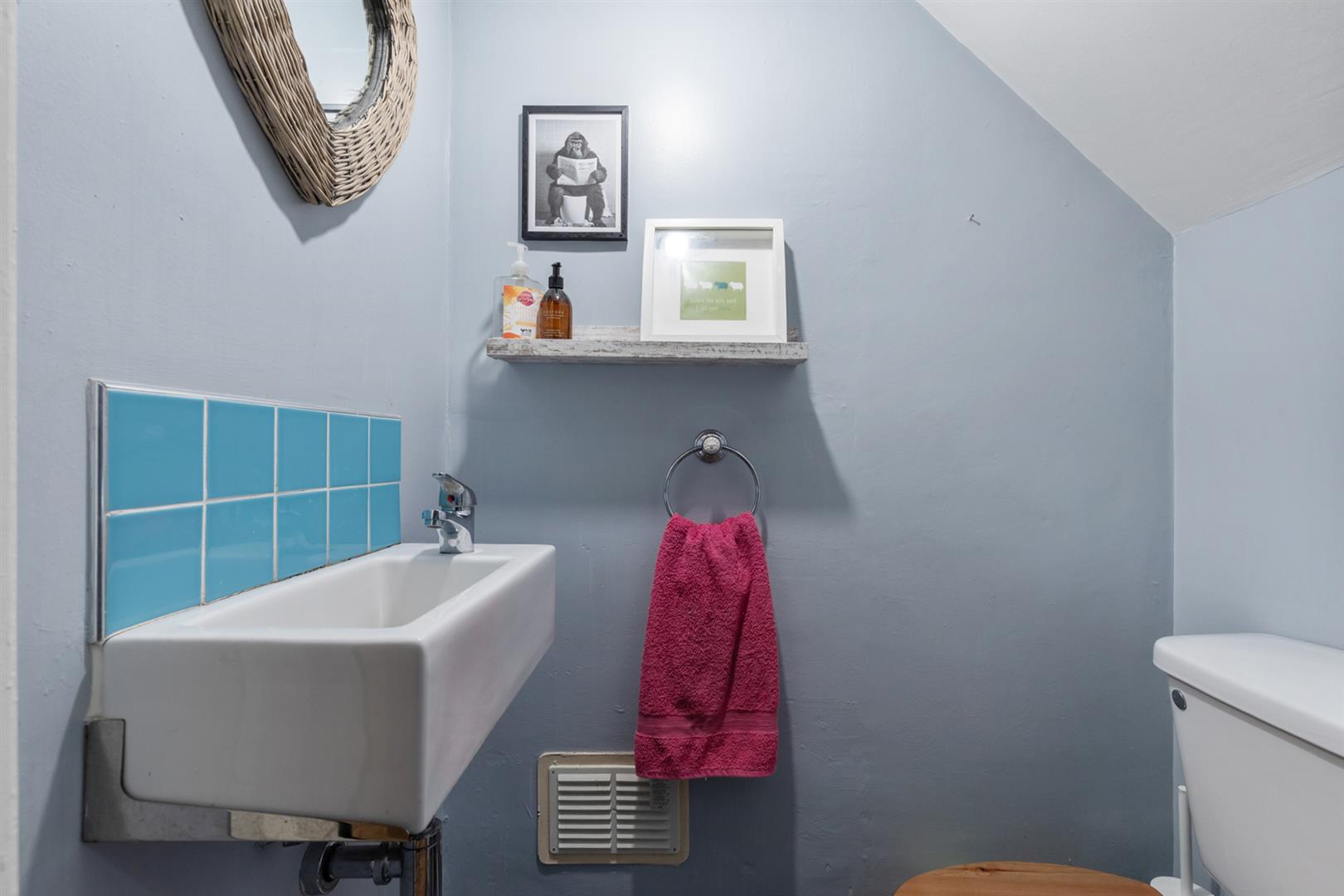 Solid strip wood flooring, cloaks cupboard, storage under stairs, low flush WC, partly tiled walls.