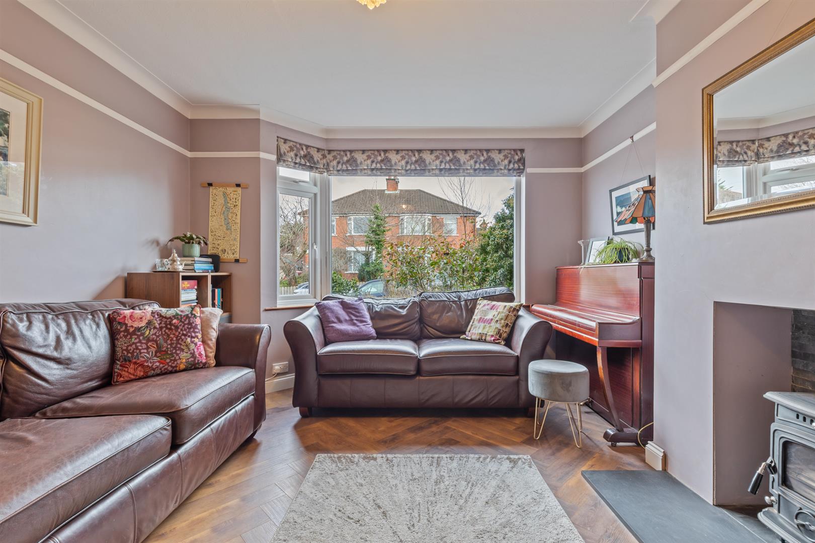 Lounge With Bay Window, Cast Iron Stove, Picture Rail, And Corniced Ceiling
