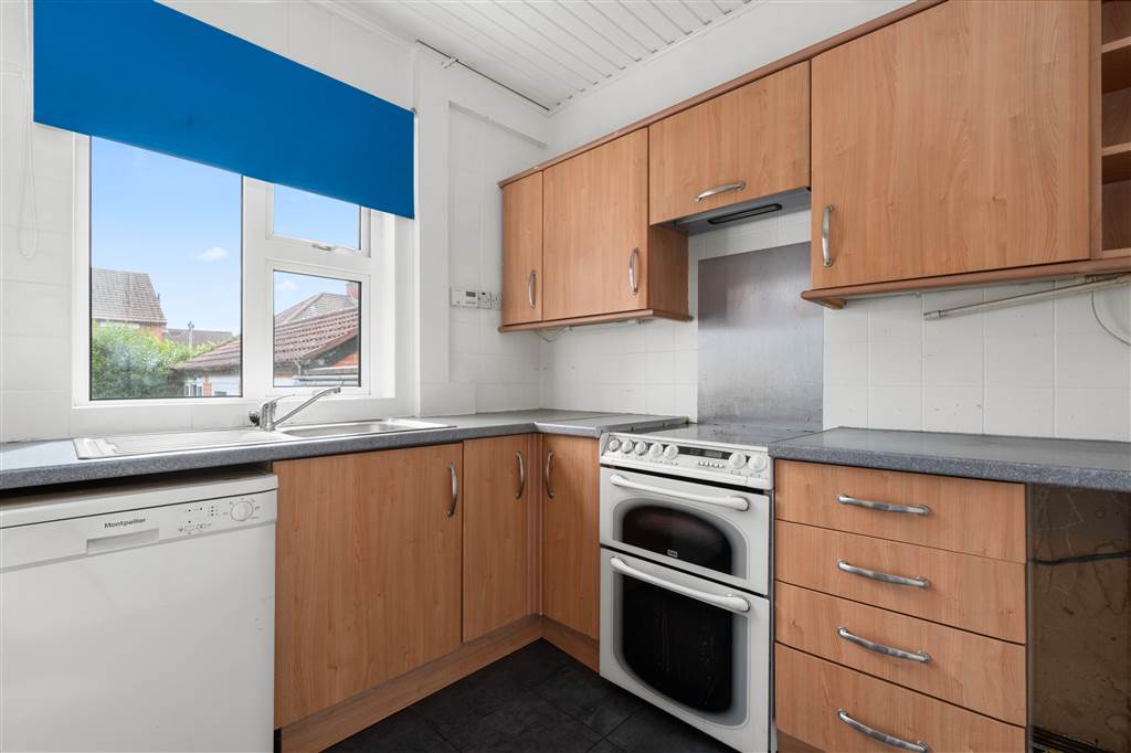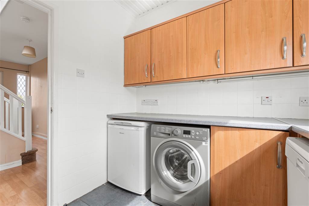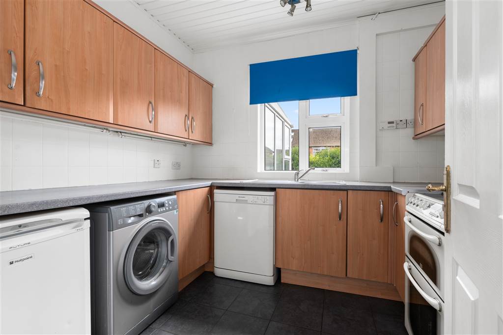 Range of high & low level units, 1.5 bowl stainless steel sink unit with mixer tap, cooker point with stainless steel splash back and concealed extractor fan over, plumbed for washing machine, partially tiled walls, ceramic tiled floor.