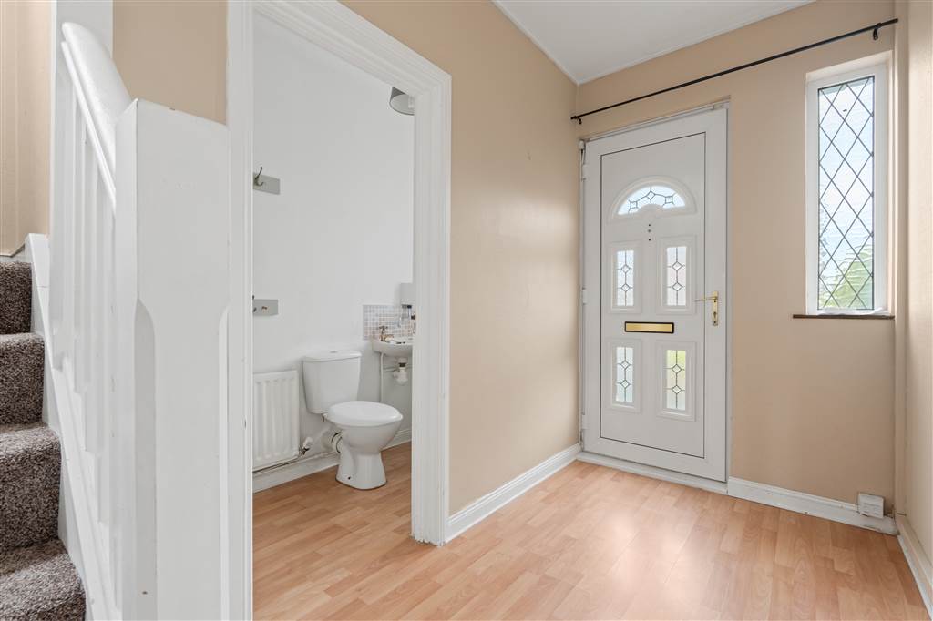 Laminate timber effect flooring, understair storage cupboard, Upvc double glazed door to side.