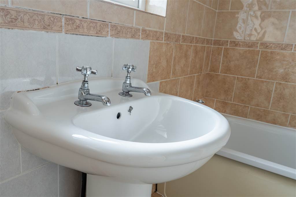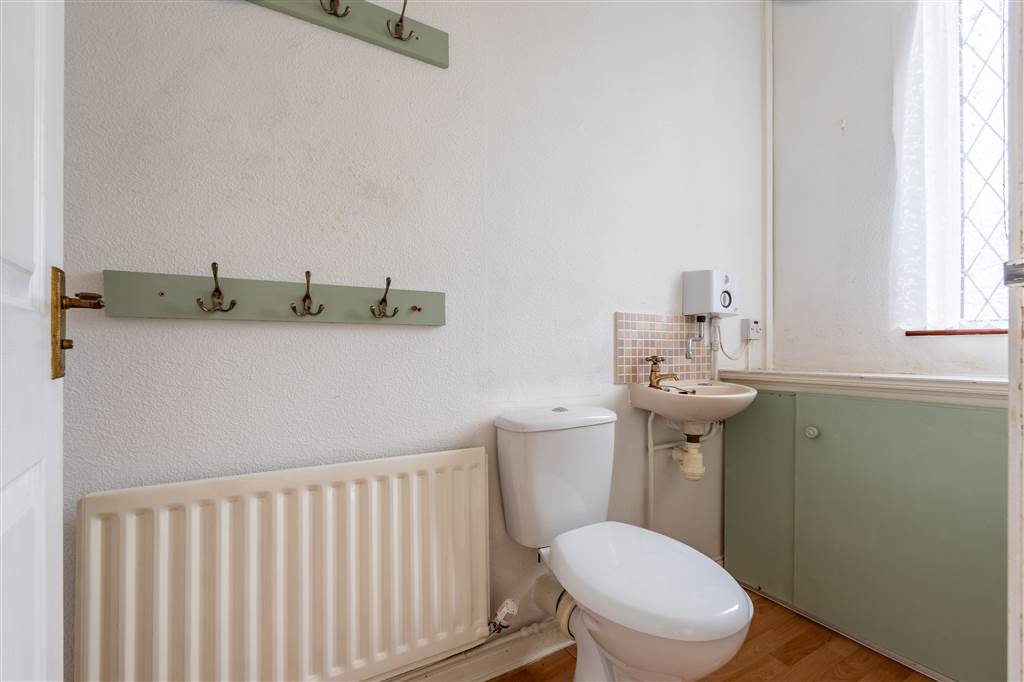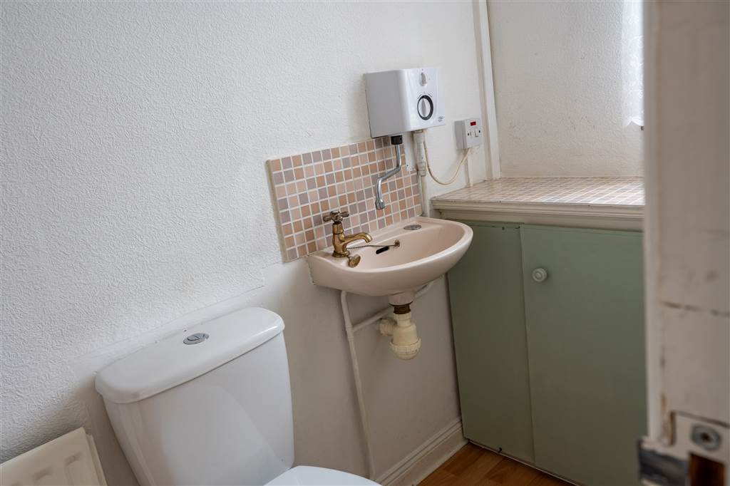 Laminate timber effect flooring, close coupled w.c., wash hand basin.