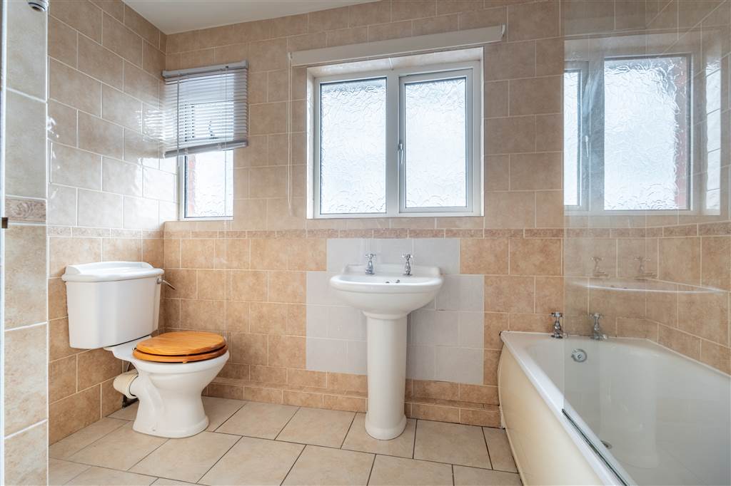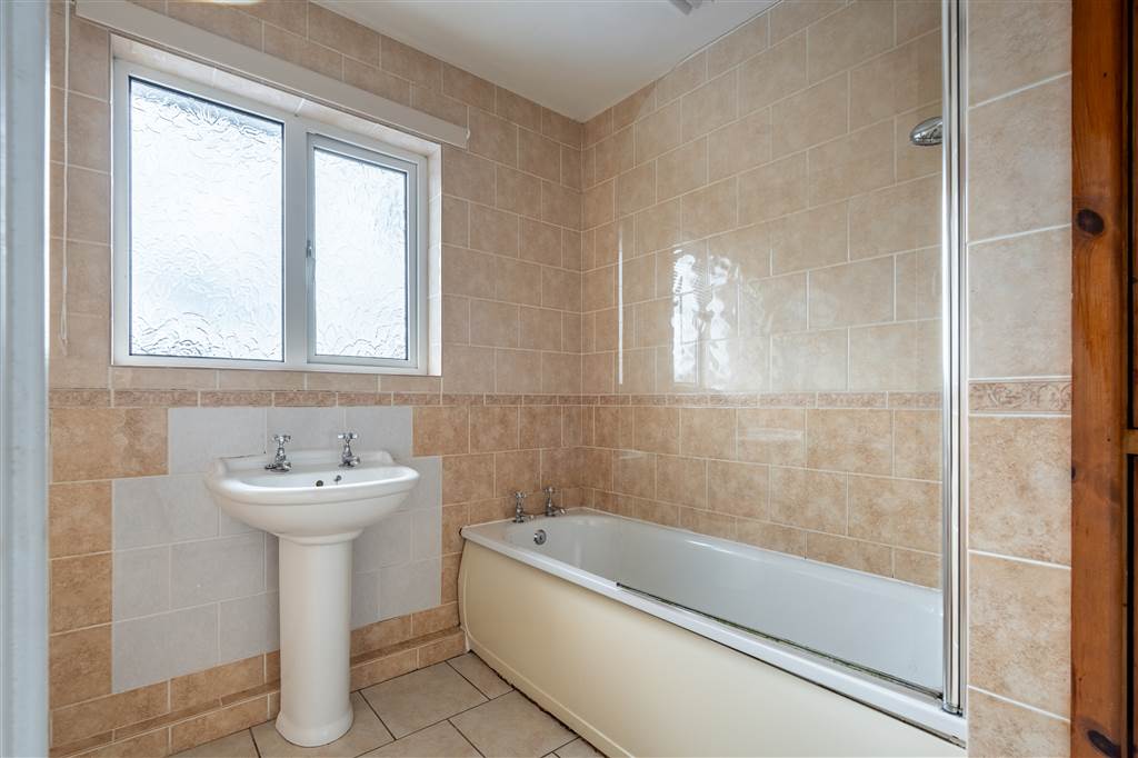White suite comprising panelled bath with 'Mira' electric shower and glazed panel over, pedestal wash hand basin, low flush w.c., fully tiled walls, ceramic tiled floor, recessed spotlighting, extractor fan, towel radiator, hot press containing 'Worcester' wall mounted gas fired boiler.