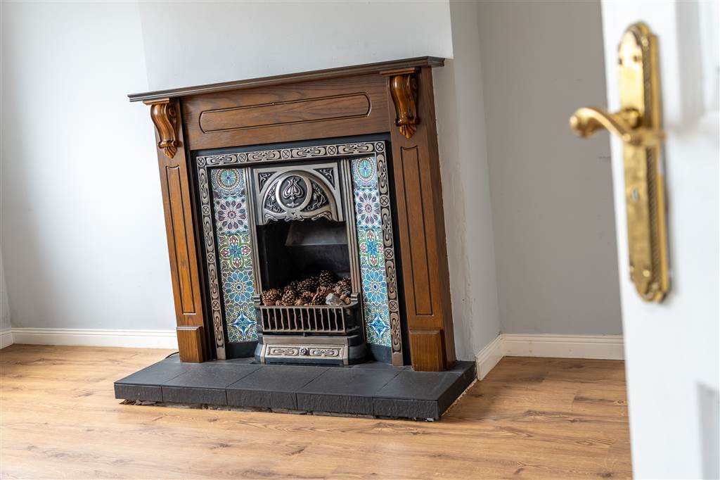 Cast iron fireplace with feature tiled inset panels, slate tiled hearth, gas fire inset, carved timber surround, picture rail, laminate timber effect flooring.