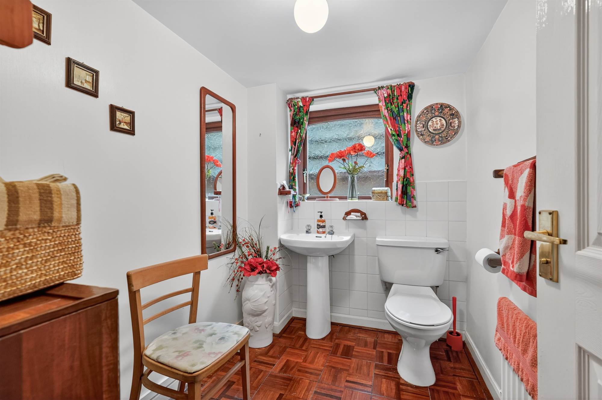 White suite comprising low flush wc, pedestal wash hand basin, part tiled walls.