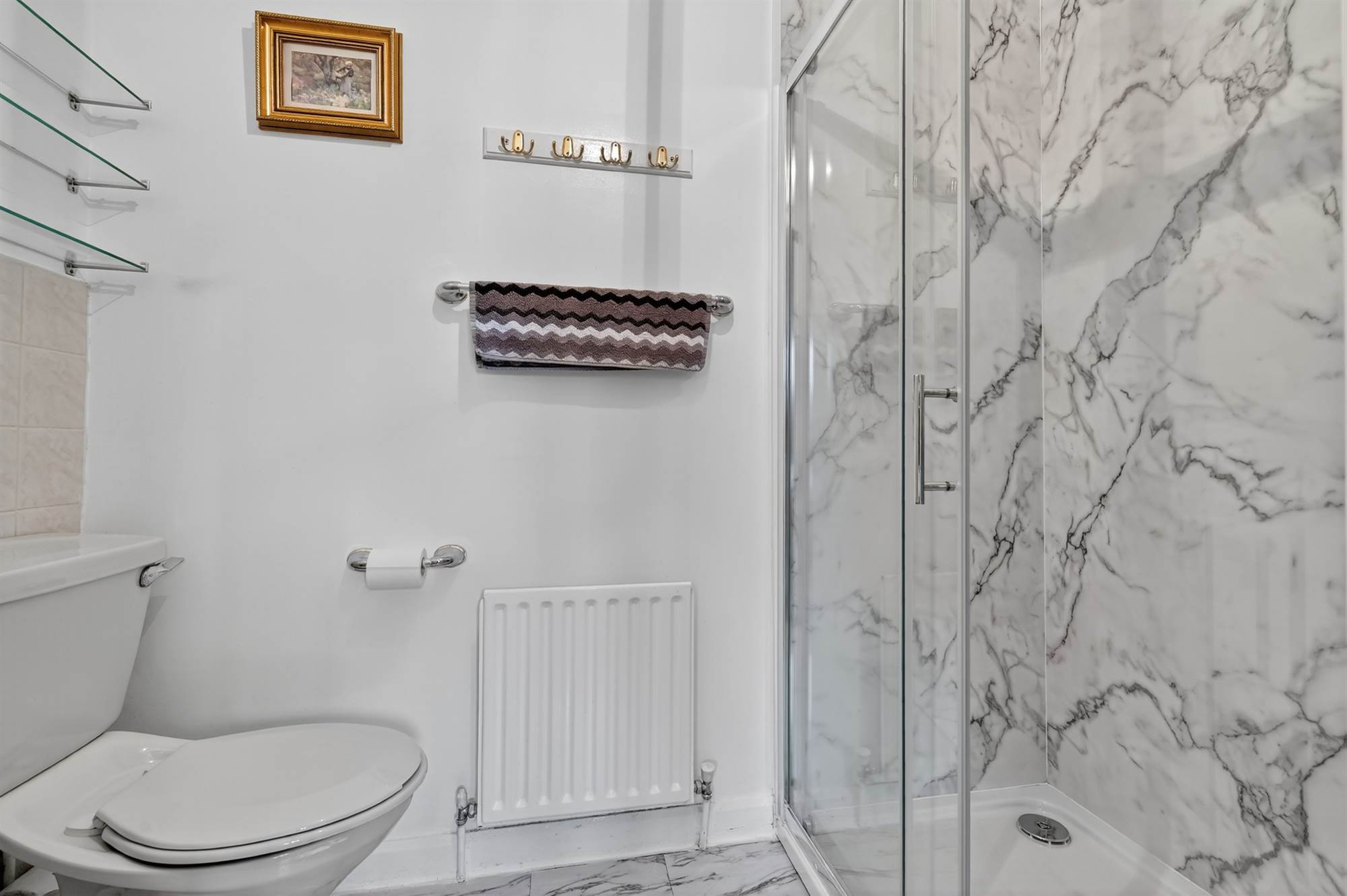White suite comprising low flush wc, shower cubicle with electric shower, low flush wc, pedestal wash hand basin with towel rail.