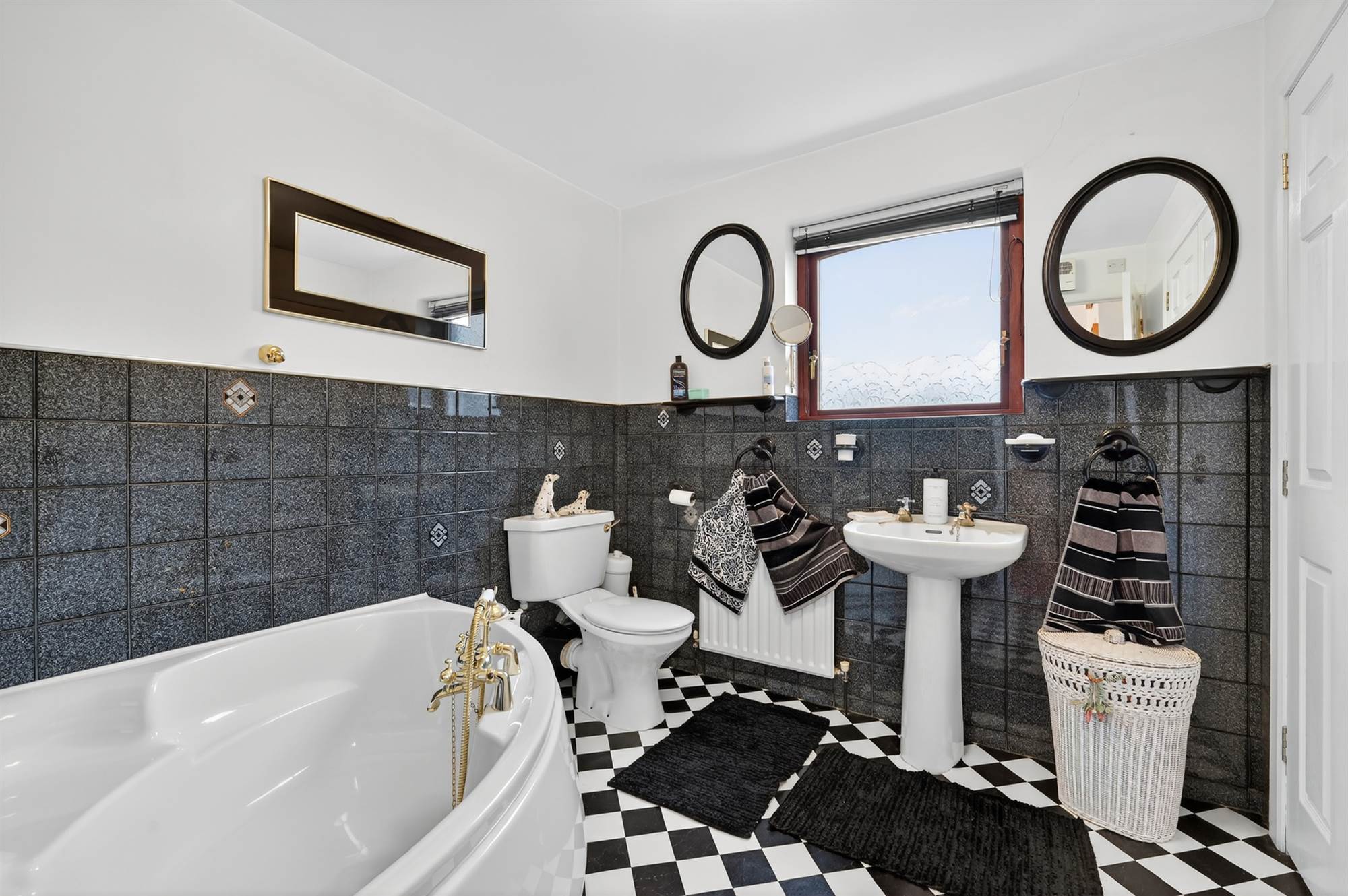 White suite comprising corner panelled bath with mixer tap and telephone hand shower, low flush wc, pedestal wash hand basin, part tiled walls, shelved hotpress with lagged copper cylinder.