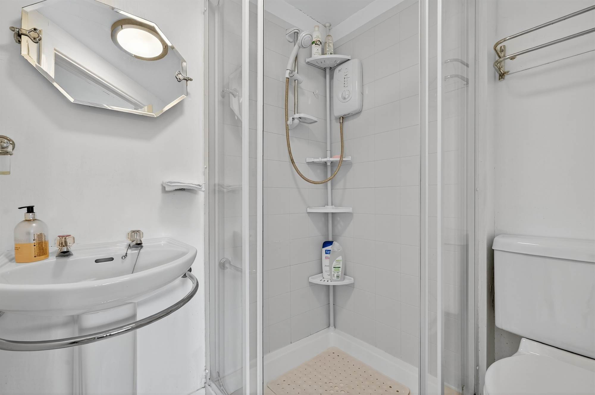 Light coloured suite comprising low flush wc, pedestal wash hand basin, shower cubicle with electric shower.