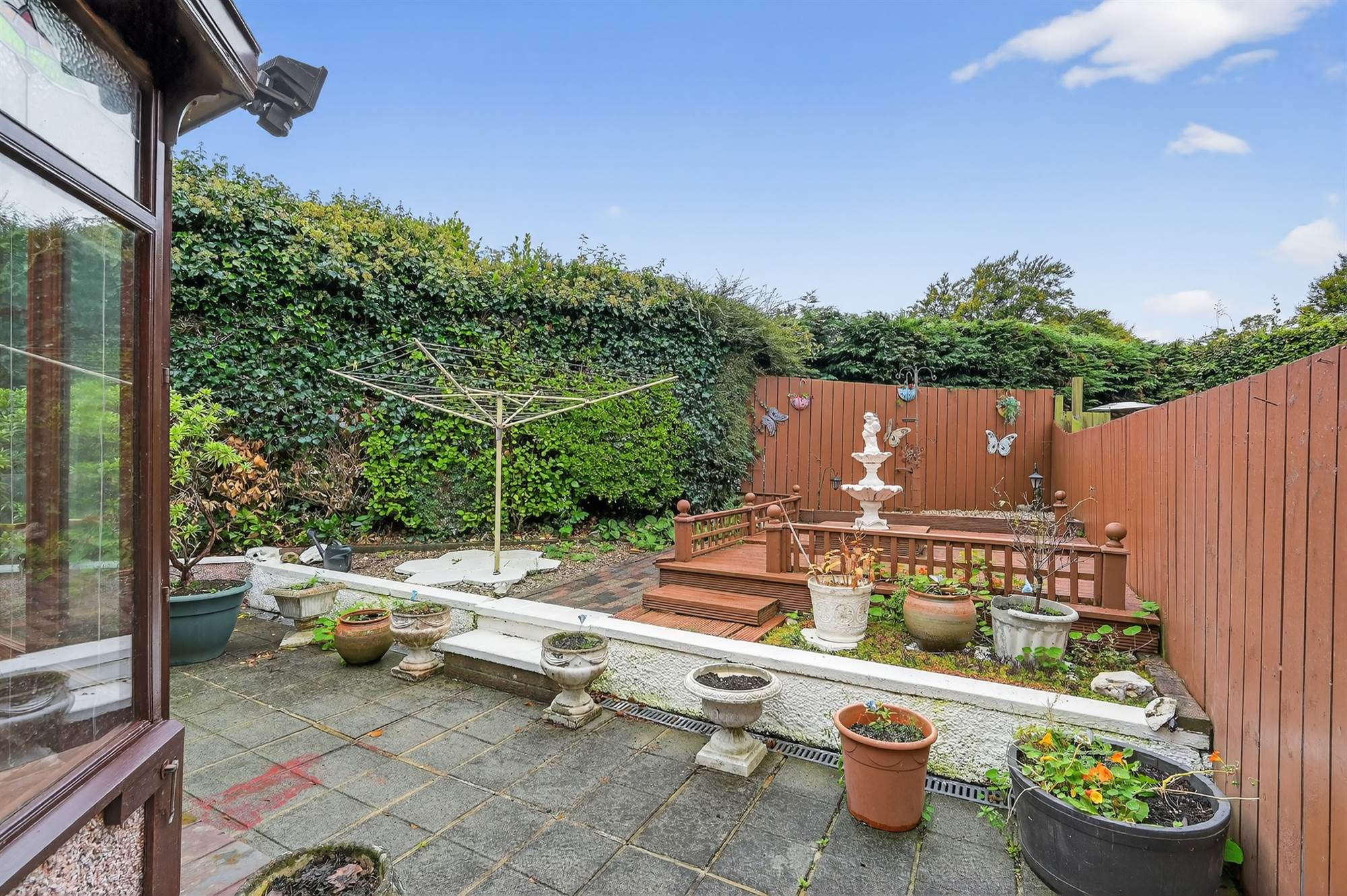 Private and enclosed garden with raised timber decking and patio seating area. Timber storage shed, boundary hedging.