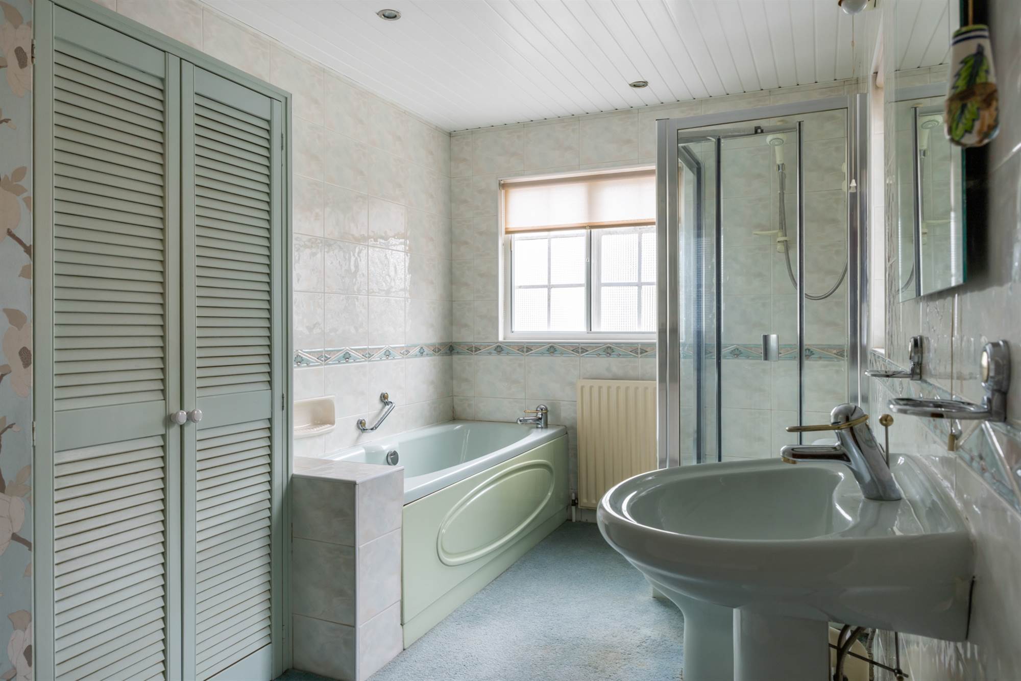 Panelled bath, low flush wc, pedestal wash hand basin. Separate, corner shower cubicle with Mira Sport electric shower. Fully tiled walls. Shelved linen cupboard with radiator.