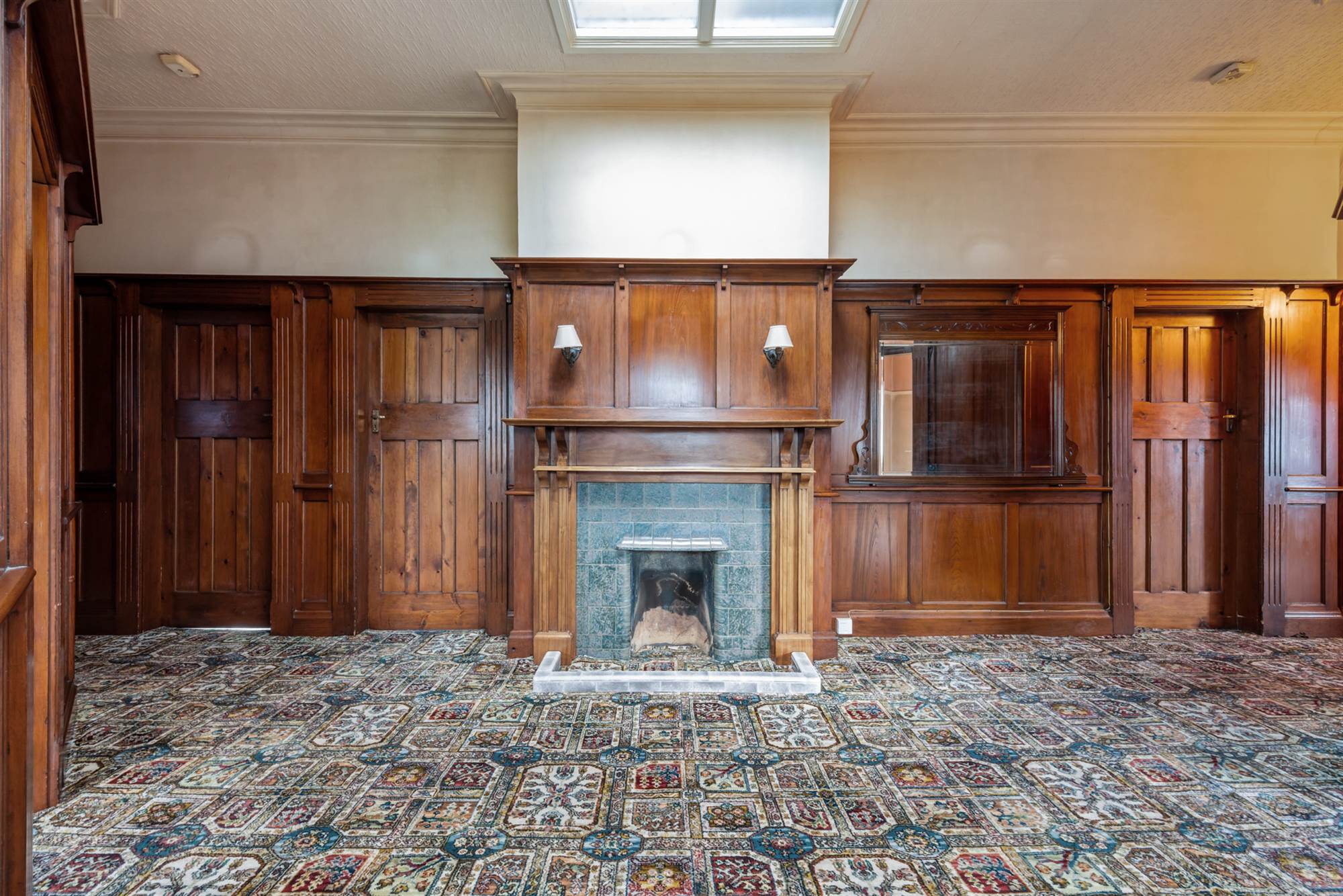 Feature tiled fireplace with wood surround. Original wood panelling with plate rack.
