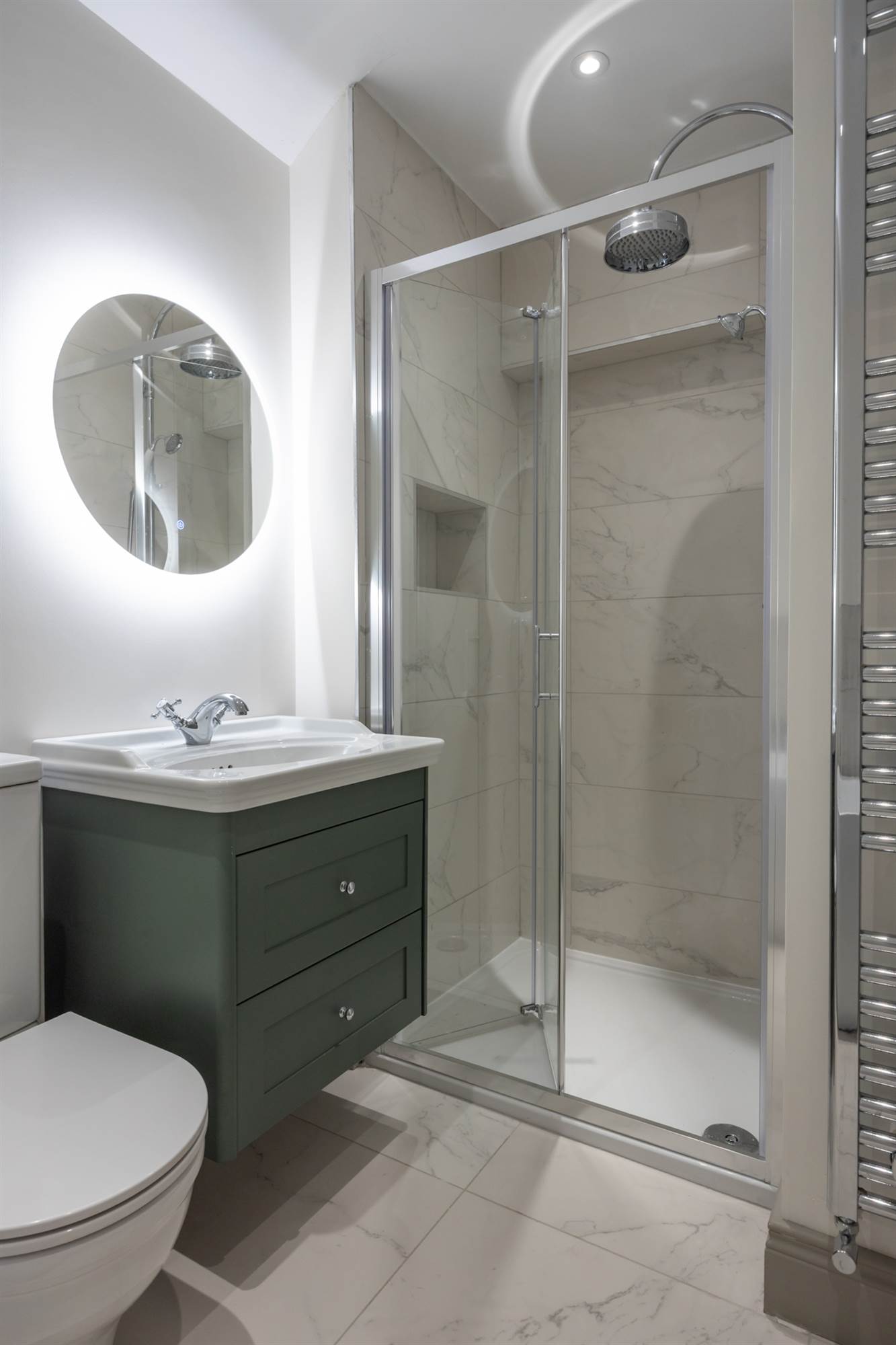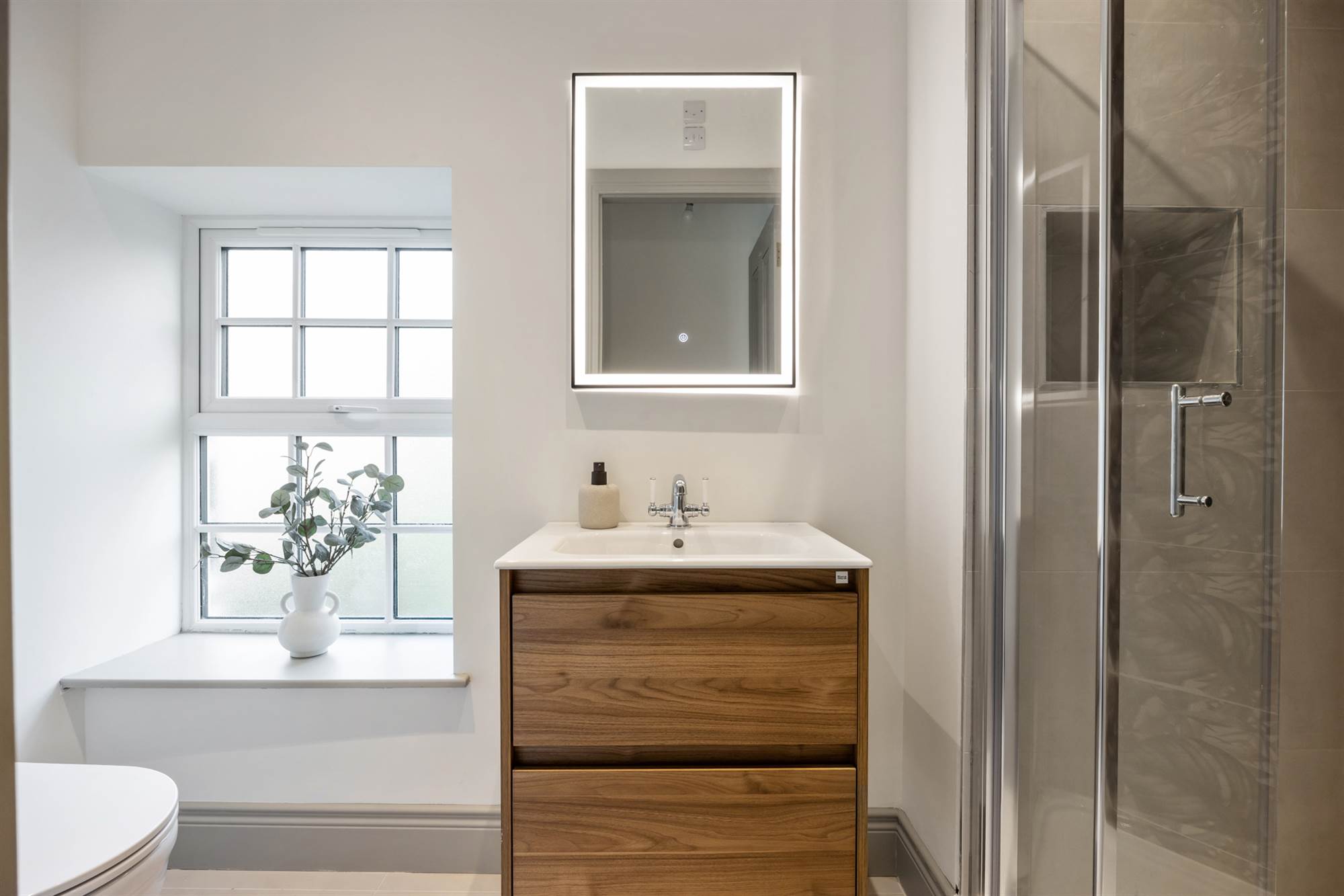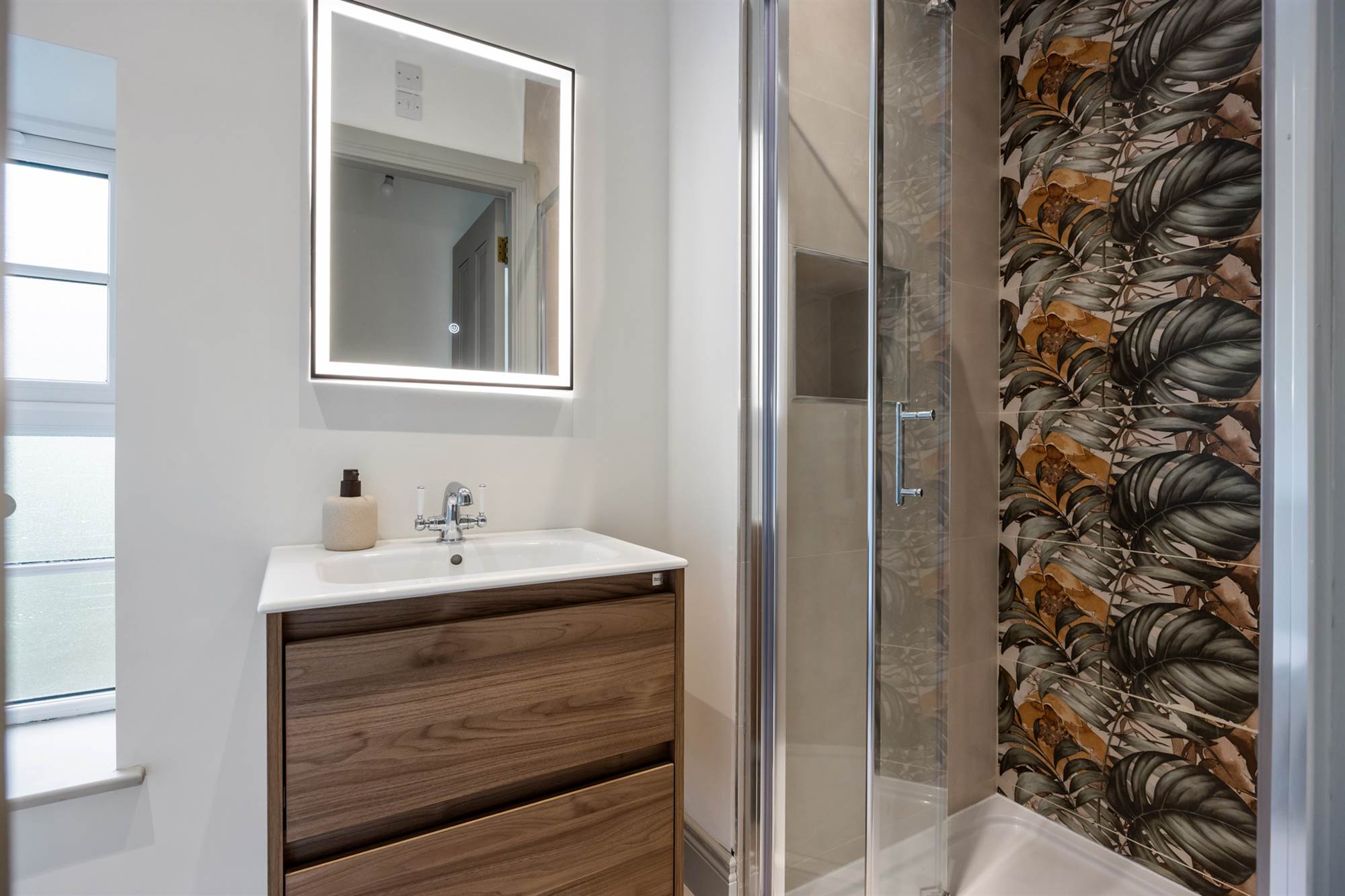 Tiled shower cubicle with "rain" drench shower and additional telephone hand shower, feature tiled wall. Roca wash hand basin with storage underneath. Low flush wc, chrome heated towel rail. Backlit mirror with touch control.