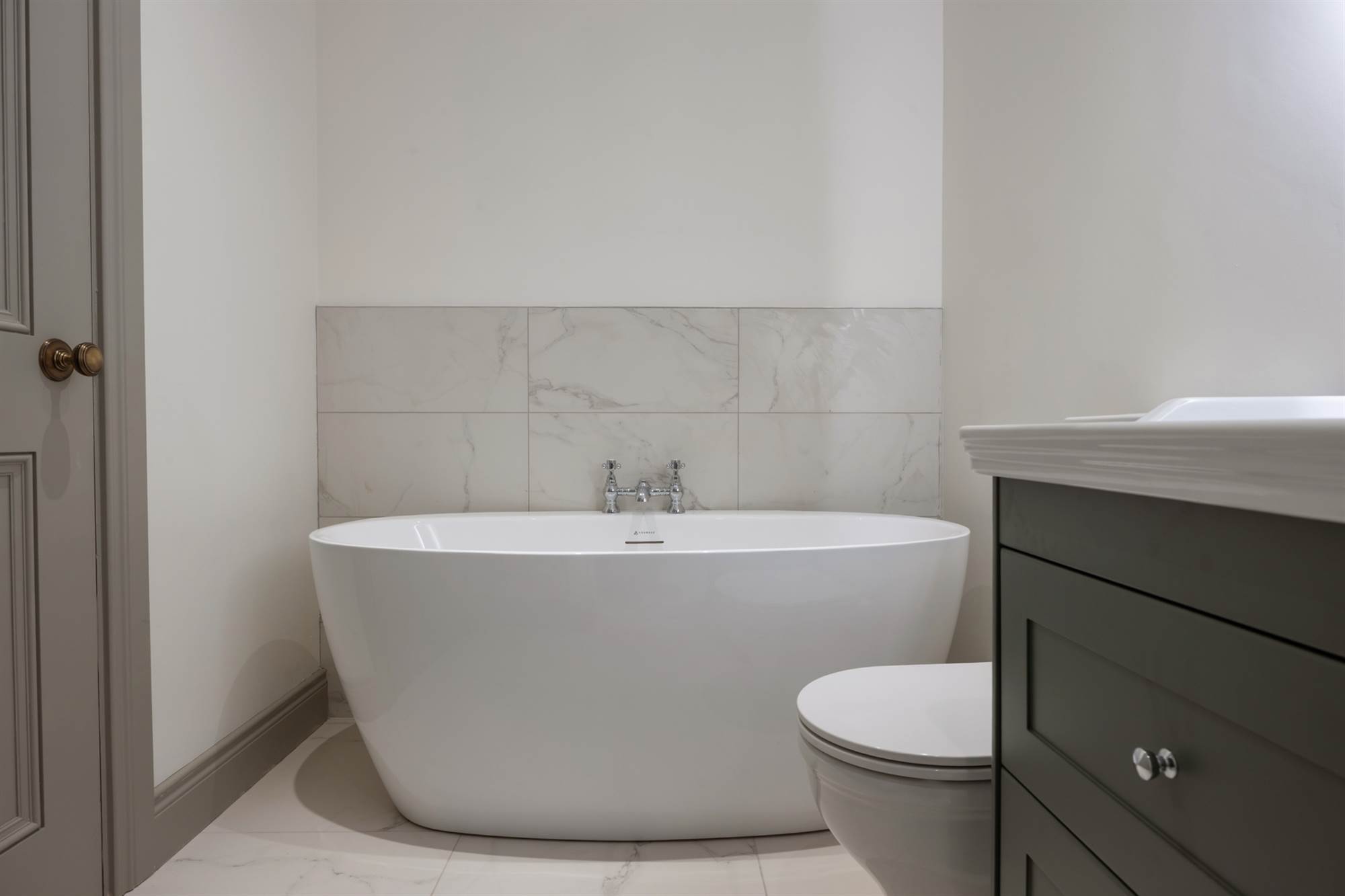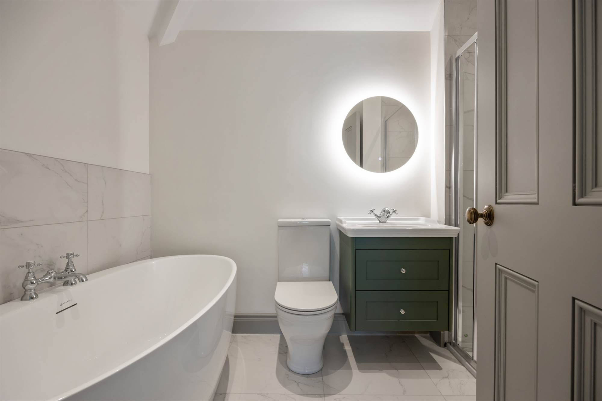 Comprising free-standing Adamsez bath. Separate, tiled shower cubicle with "rain" drench shower and additional hand shower. Kale wash hand basin with storage underneath. Low flush wc, part tiled walls, ceramic tiled floor. Backlit mirror with touch control.