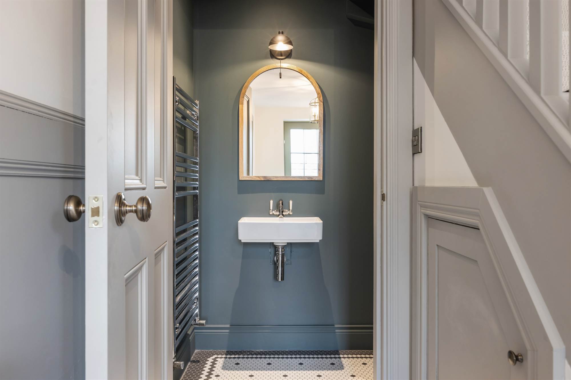 Feature black and white ceramic tiled floor, period-style radiator. Part-panelled walls. Understairs storage cupboard.