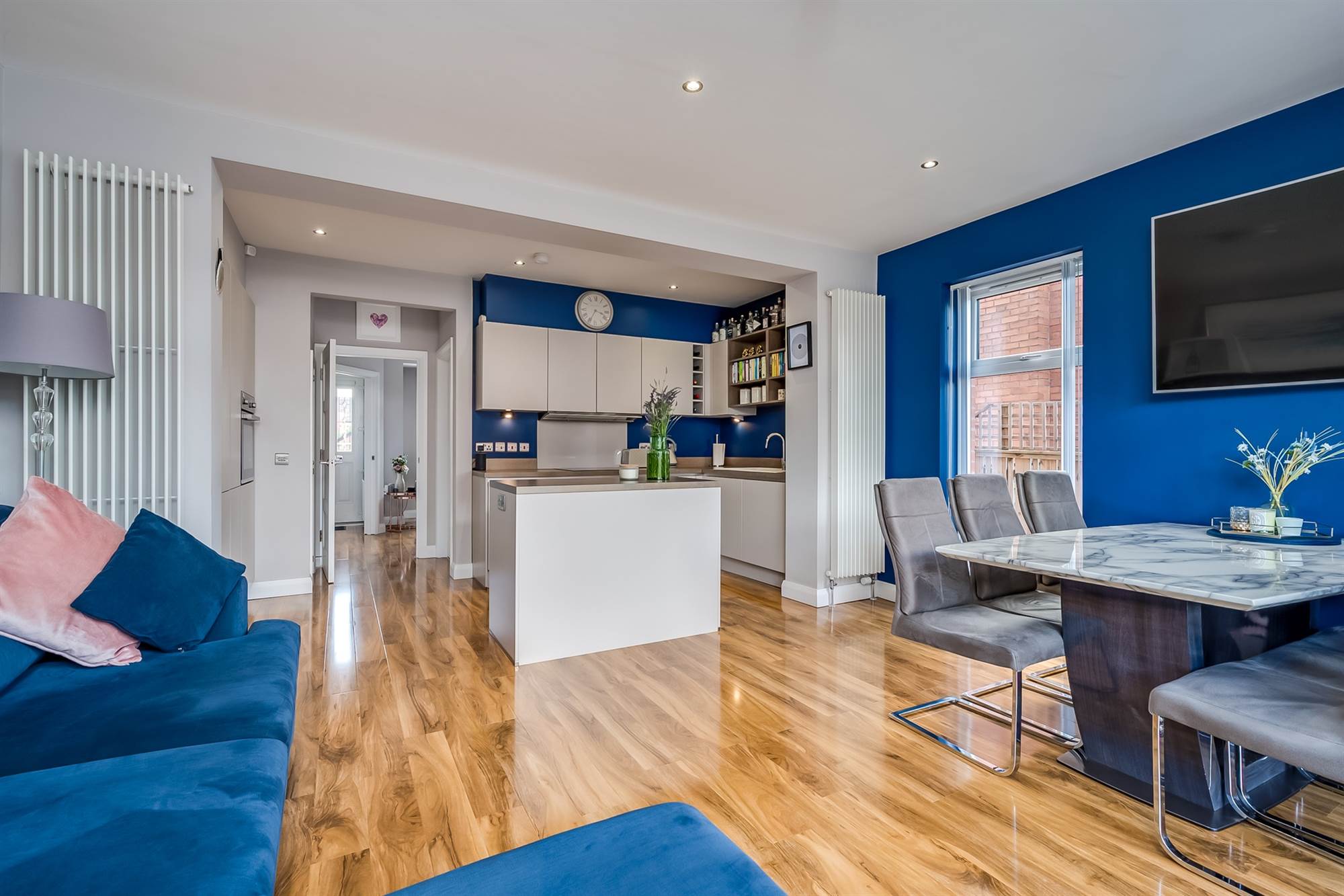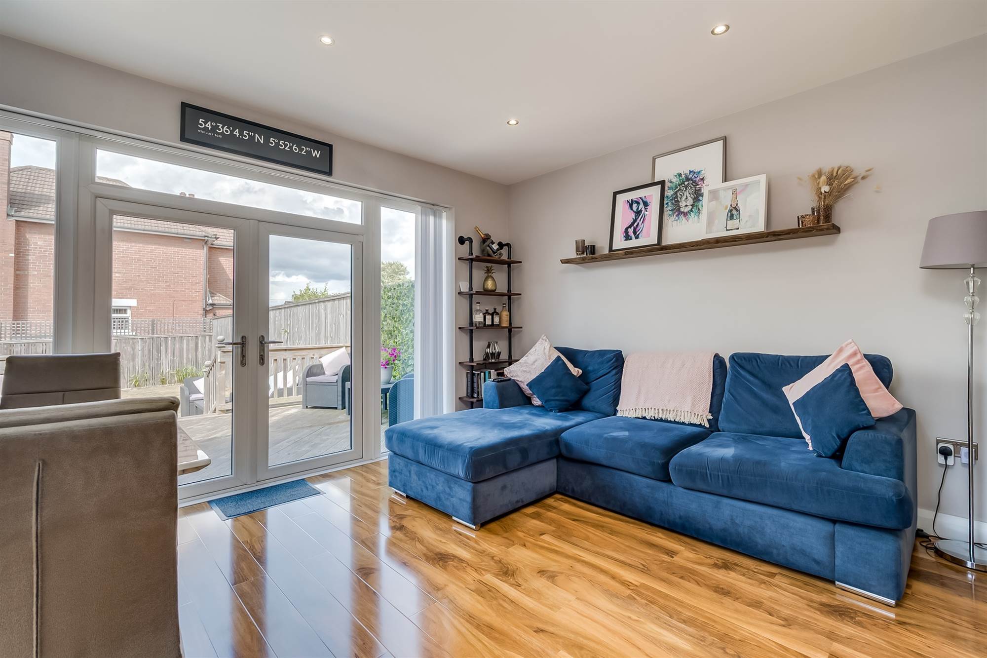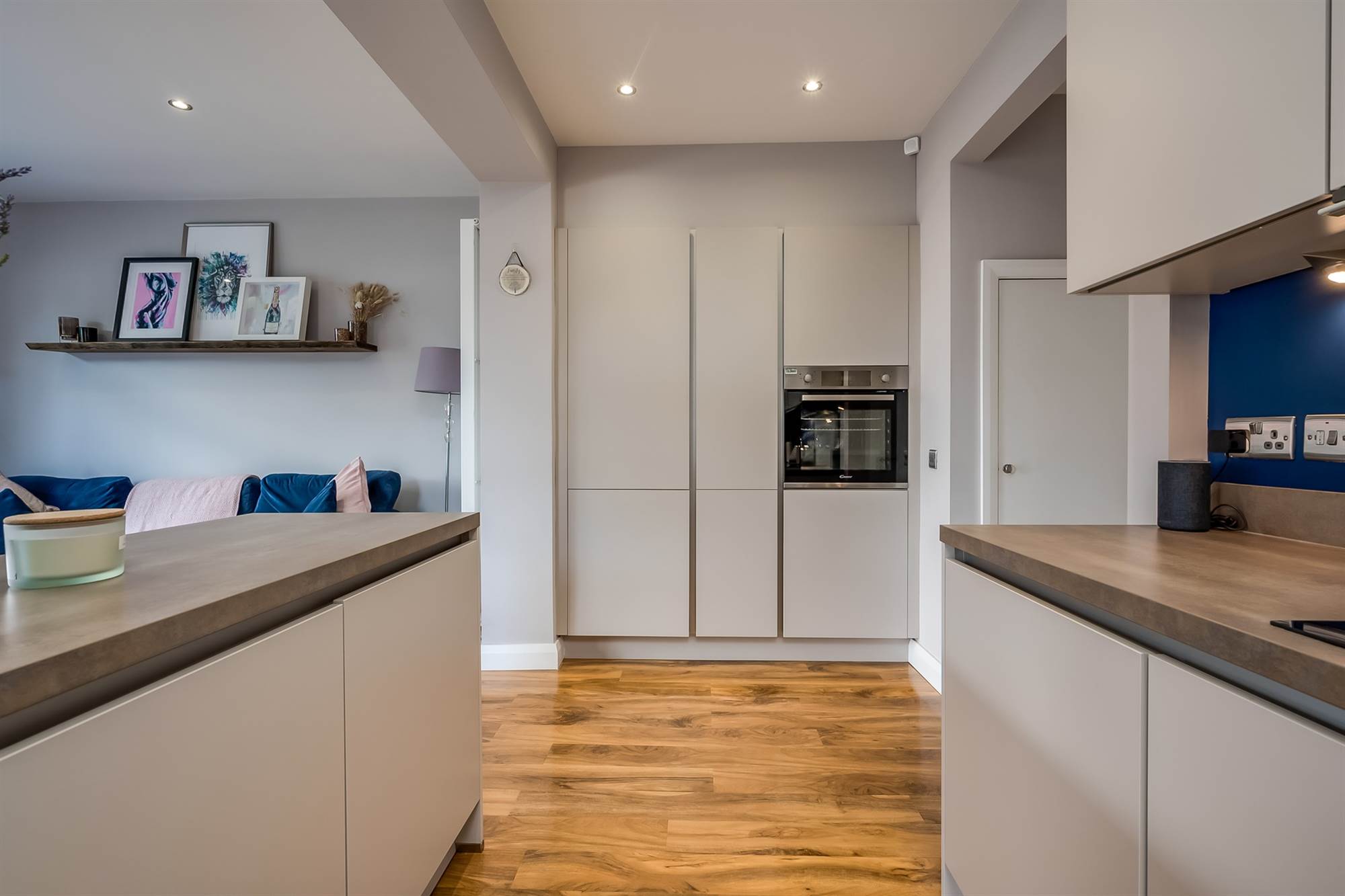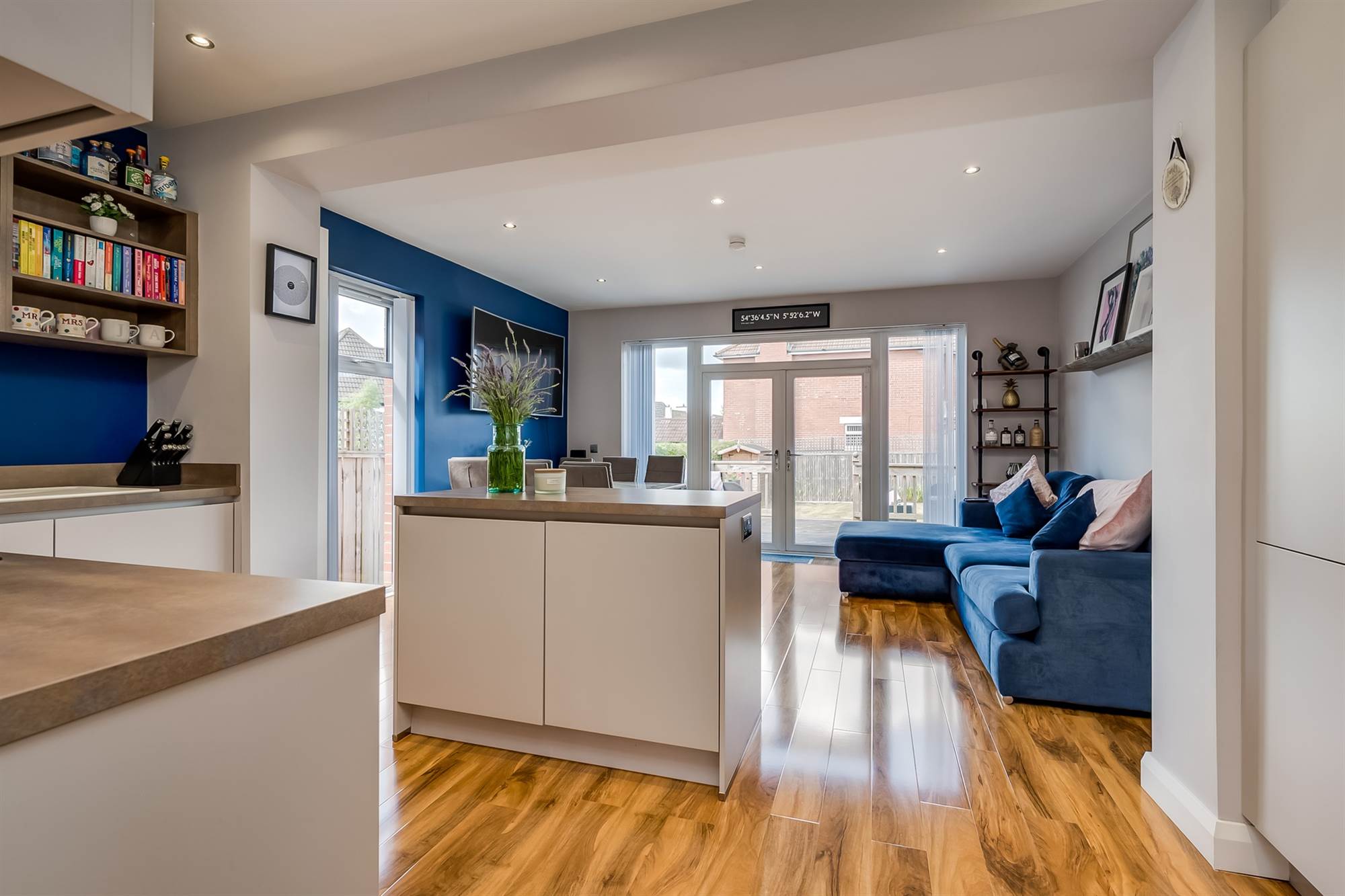 Modern range of high and low level units, integrated appliances including four ring hob with extractor fan over. Stainless steel oven, washer-dryer, dishwasher, fridge, freezer, single drainer sink unit with mixer tap. Display shelves and wine rack. Engineered wood flooring, feature radiators. Open plan casual living and dining areas. French doors to deck and garden. Access to pantry cupboard with shelving and electrics.
