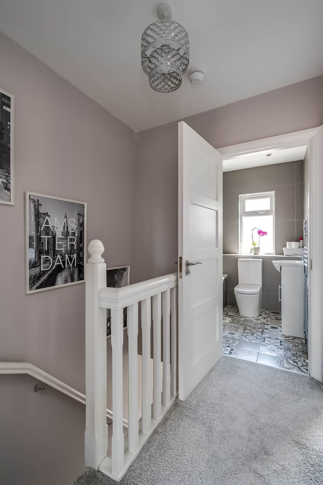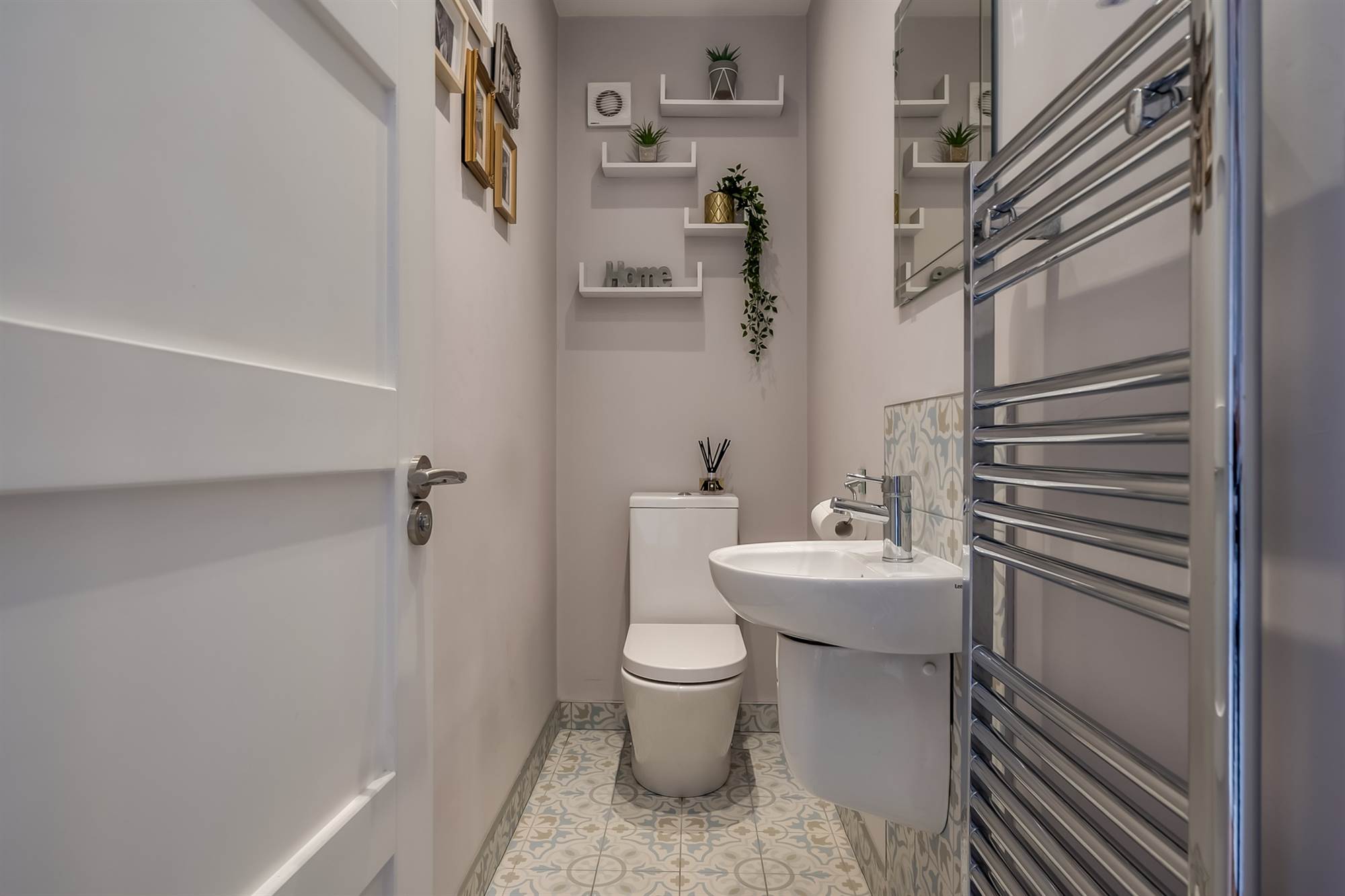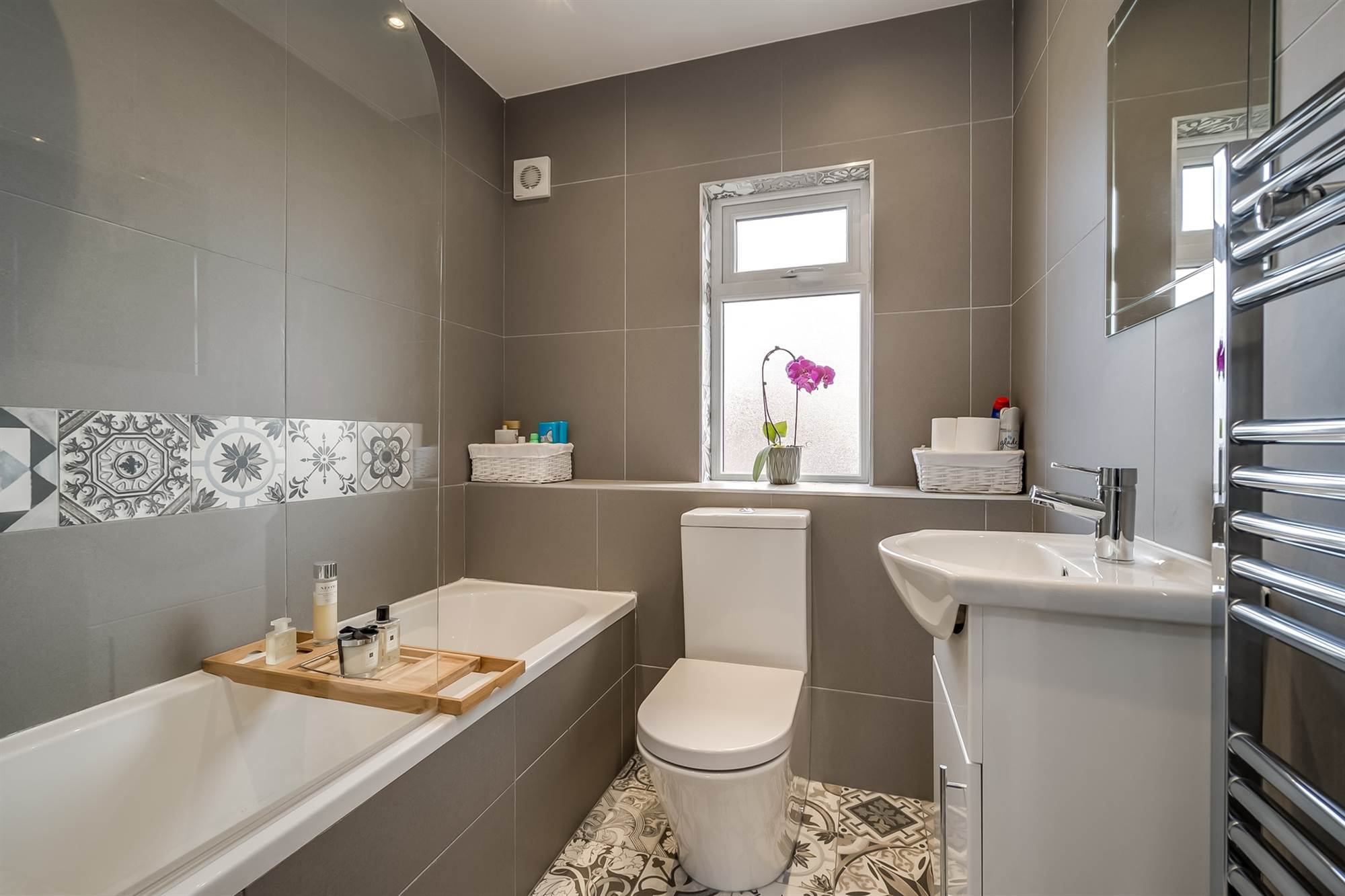 Low flush wc, wash hand basin with tiled splashback. Chrome heated towel rail, feature tiled floor.