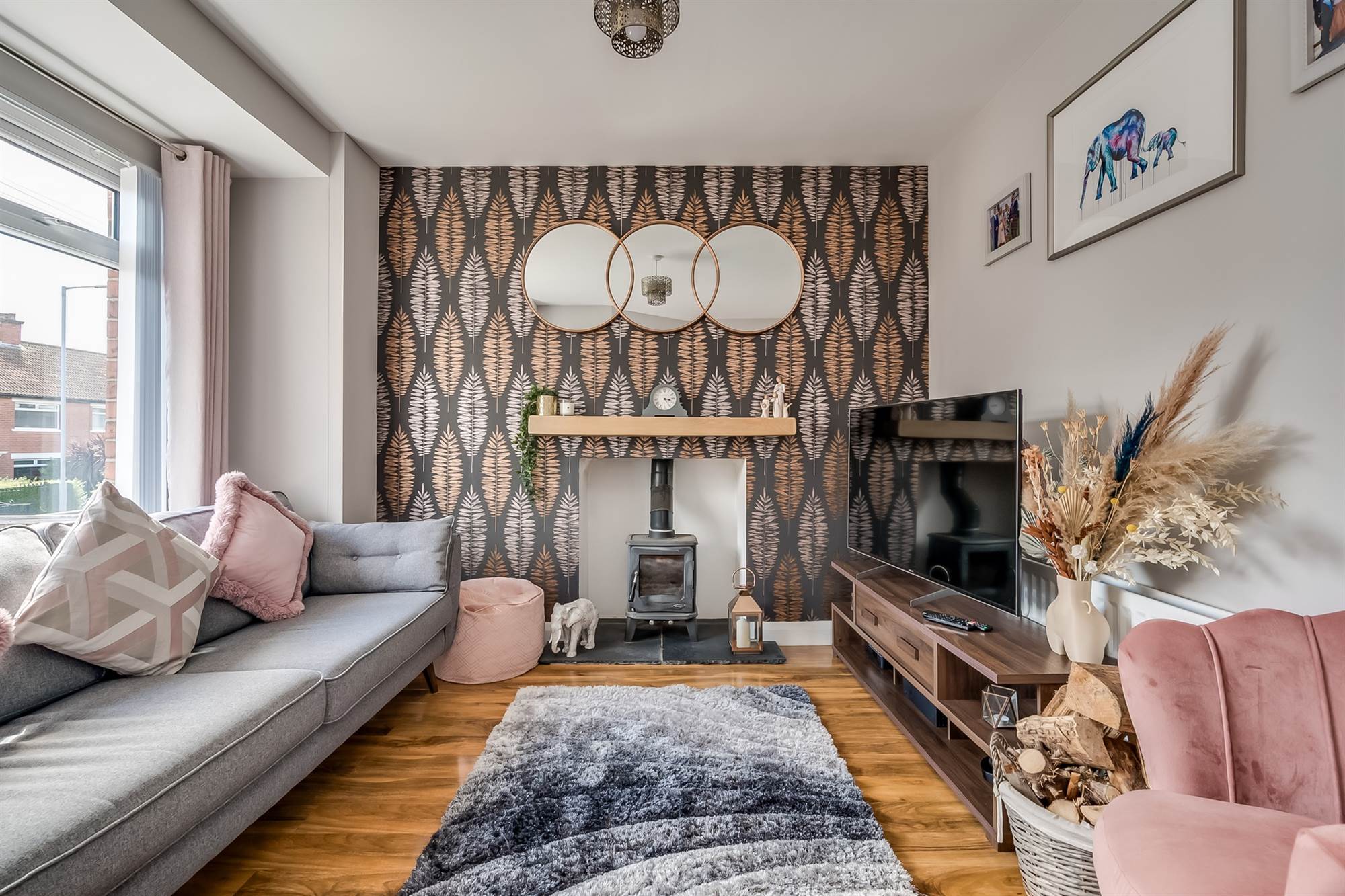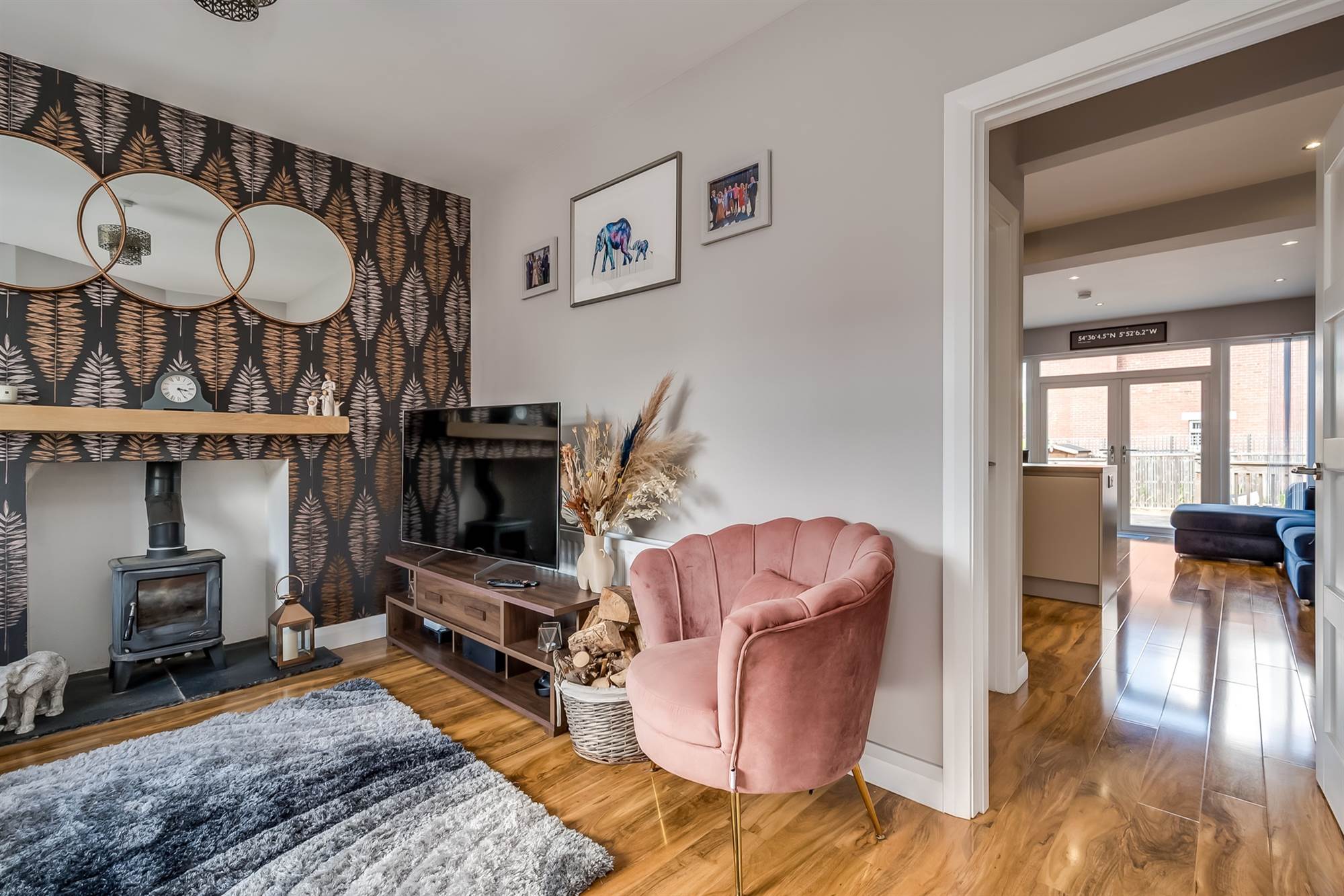 (Into bay). Heritage wood-burner on slate hearth. Floating mantle. Engineered wood flooring.
