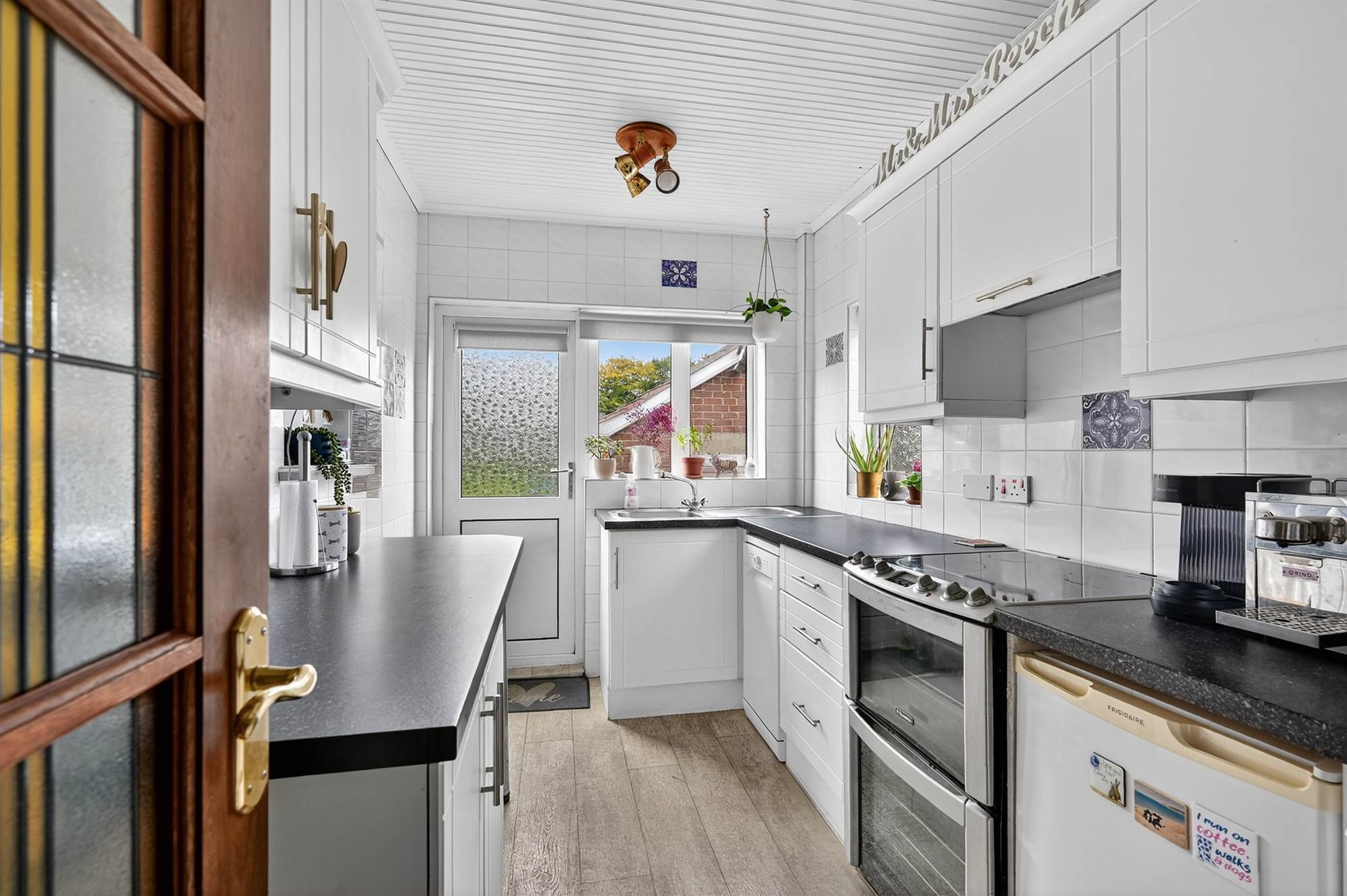 Range of high and low level units, work surfaces, stainless steel sink unit with chrome mixer tap. Space for oven/hob, extractor fan. Space for fridge/freezer. Plumbed for dishwasher. Fully tiled walls, uPVC door to rear. Wood effect flooring.