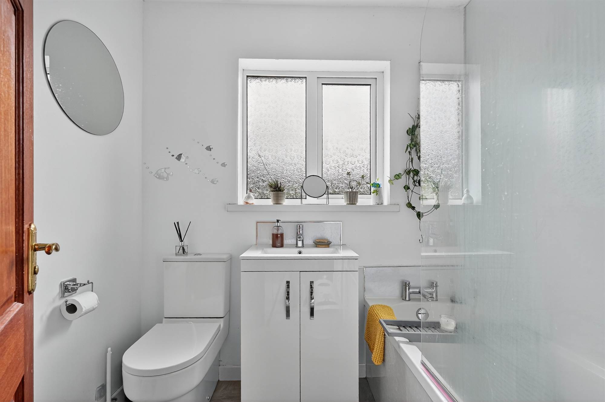 White suite comprising dual flush wc, vanity unit with ceramic sink and mixer tap. Panelled bath with mixer tap, glass screen and shower. Part tiled walls.