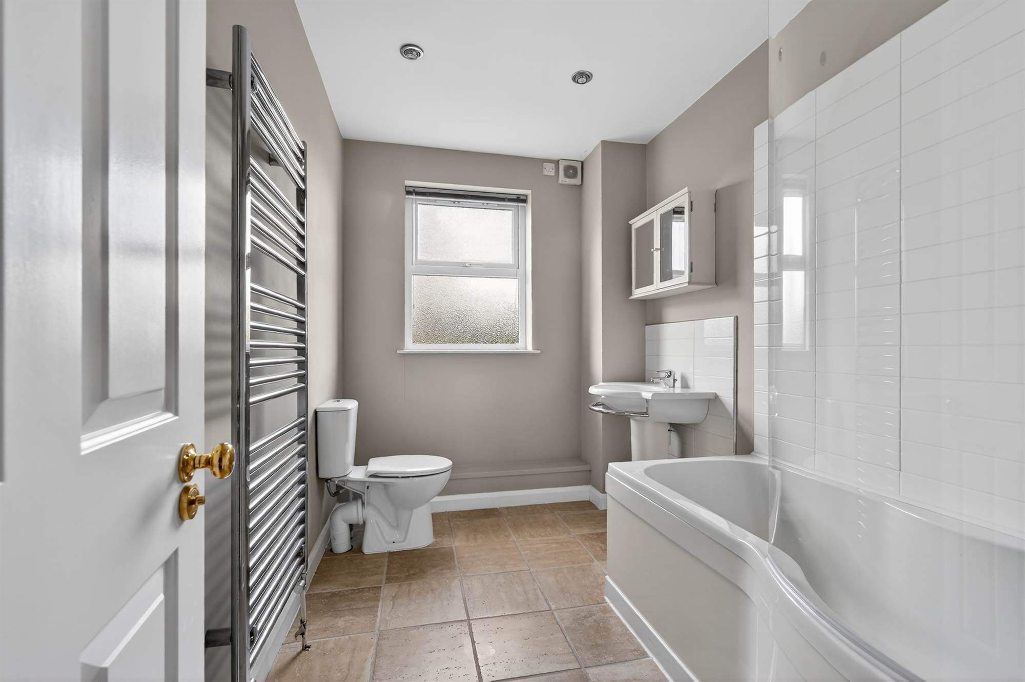 White suite comprising shower/bath with screen. Pedestal wash hand basin with tiled splashback, low flush wc, chrome heated towel rail. Part tiled walls, ceramic tiled floor.