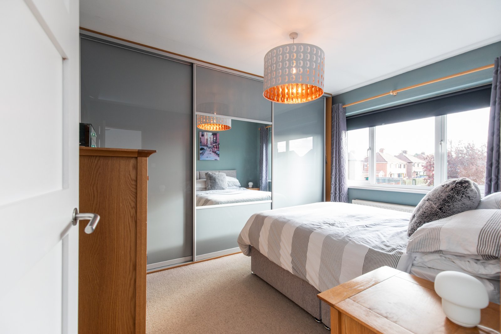 Wardrobes with mirrored sliding doors.