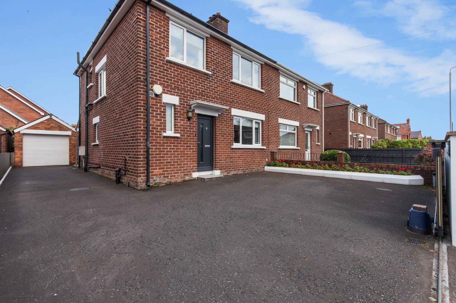 Bin store to side. To the front is a large driveway.
