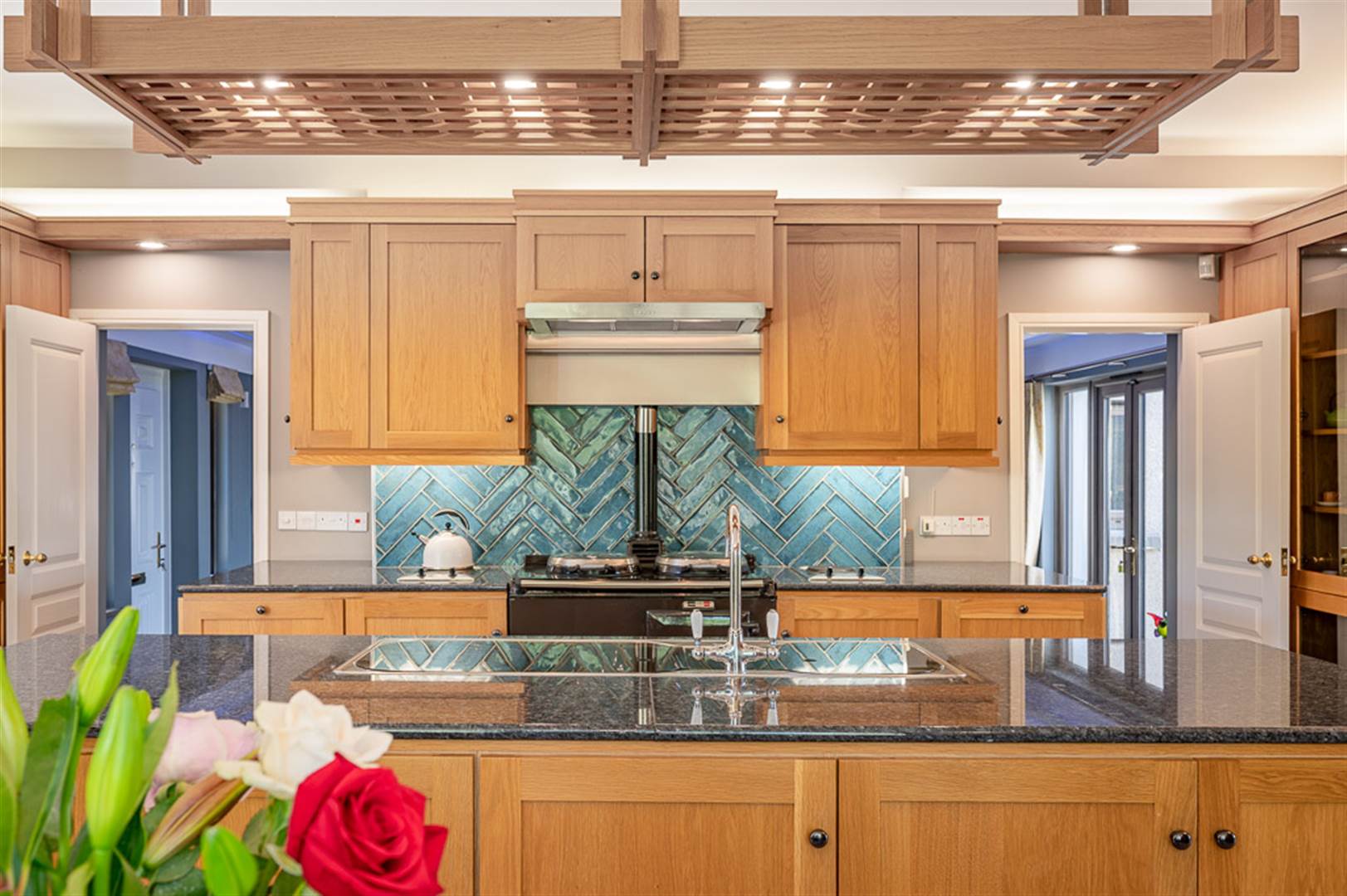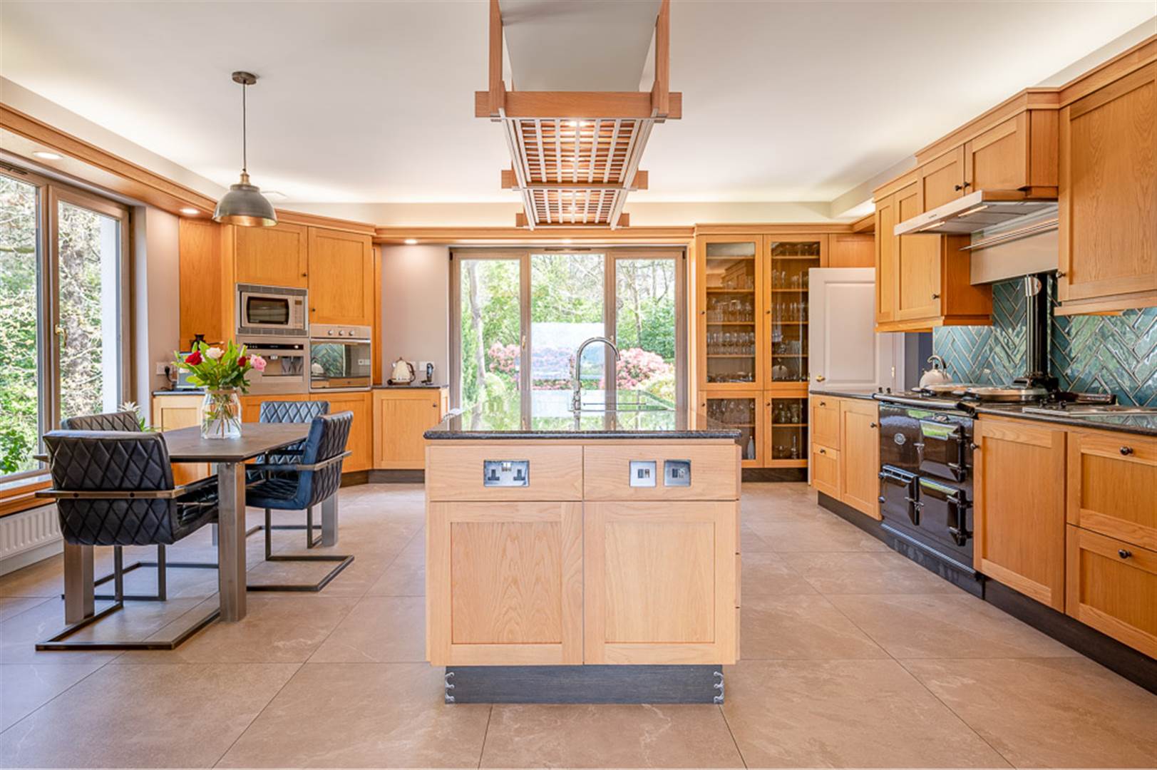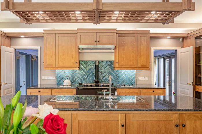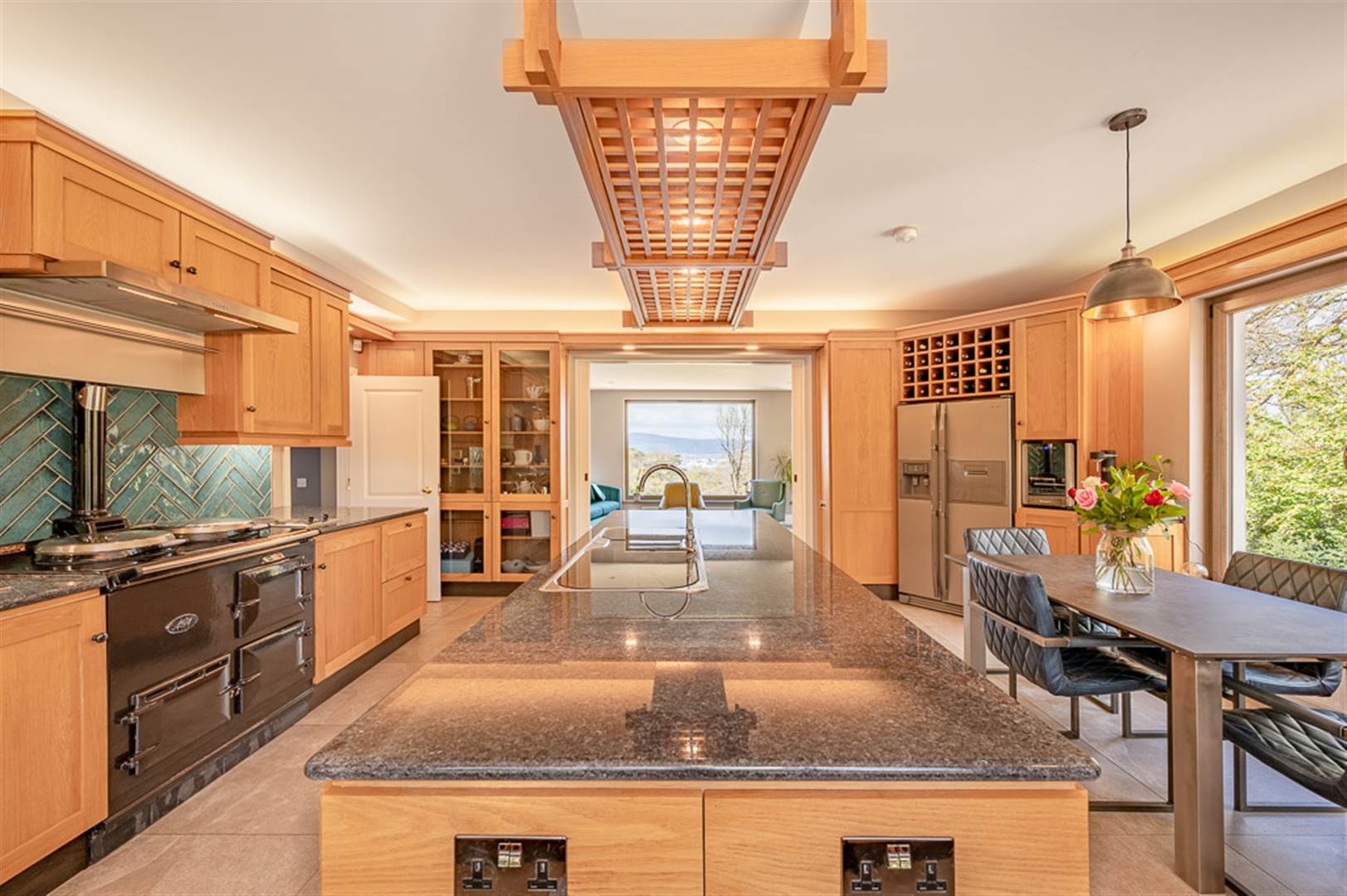 Extensive range of hand crafted solid oak Shaker style cabinets with display cabinets, wine rack, crafted pelmets plus a central island with bull nose granite worktops, double sink with mixer tap and feature overhanging lighting, beautiful Aga, handcrafted Aqua colour tiled splashback, under unit lighting, set of two stainless steel double hobs, integrated Hotpoint eye level oven, microwave and Baumatic Expresso machine, space for American fridge freezer, integrated Bosch dishwasher, porcelain tiled floor, beautiful window seat with open views across the grounds, double pocket doors to: