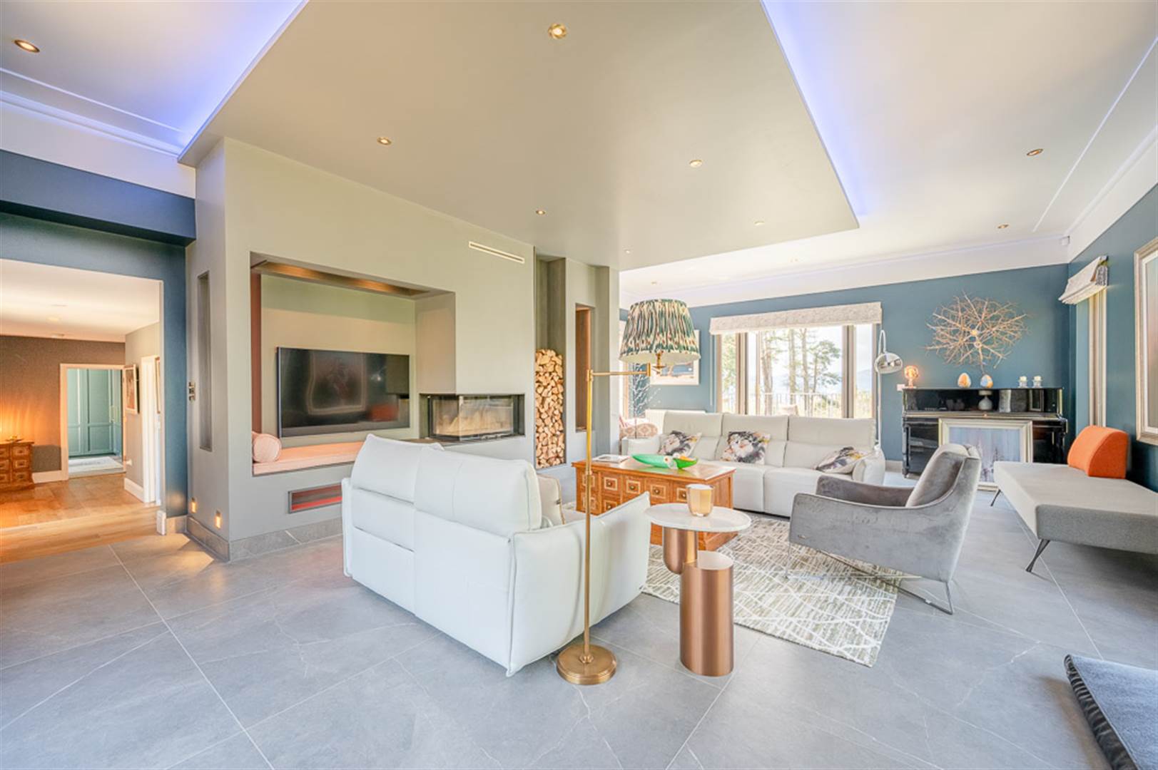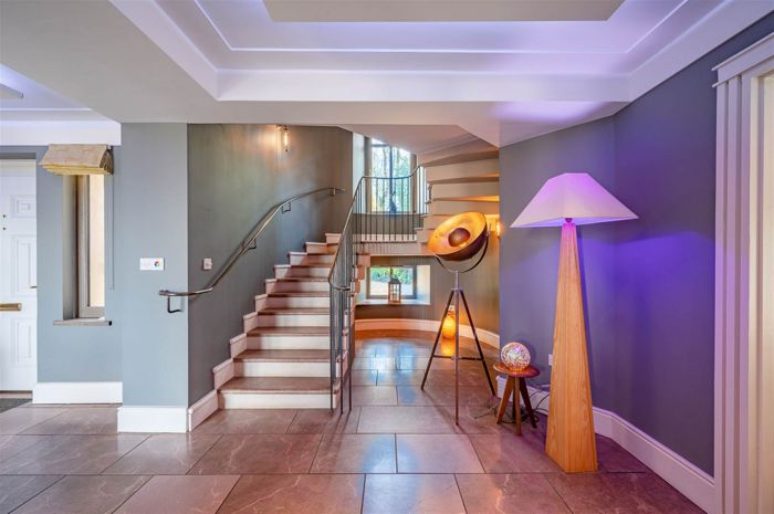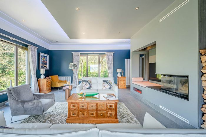 Internally you are met by a spacious dining reception room which offers many focal points from the stone fireplace, marble flooring, cantilevered staircase to the views stretching over the grounds