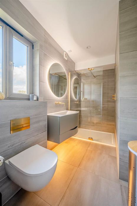 Fully tiled double shower unit with over drencher and telephone shower in an antique gold finish, contemporary "Burgbad" sink with wall mounted antique gold finish taps, under unit cabinets, wall mounted chrome mirror with lighting, Geberit closed coupe low flush wc, modern wall mounted radiator, four inset tiled display shelves with downlighting, porcelain tiled floor, fully tiled walls, extractor fan, low voltage lighting.