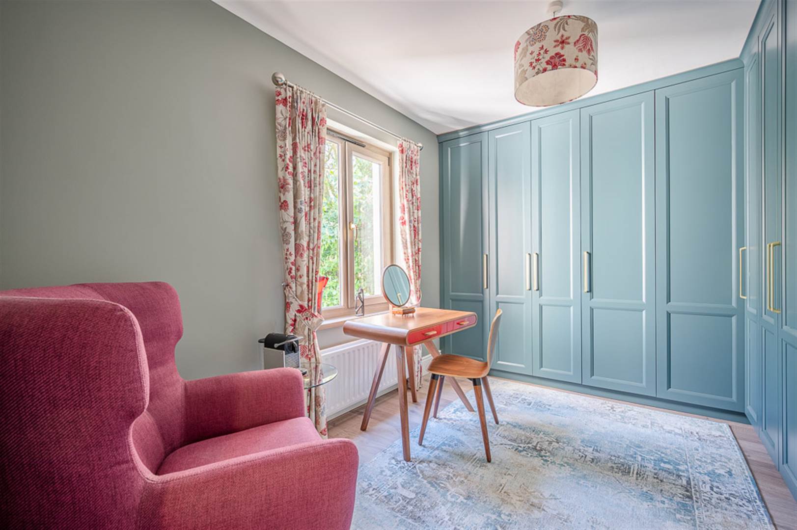 Extensive range of bespoke built-in wardrobes with shaker style doors painted in De Nimes by Farrow & Ball, open hanging space with lighting, engineered limed oak flooring.