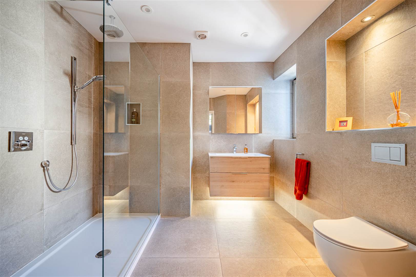 Fully tiled triple walk-in shower cubical with Hansgrohe over drencher and telephone shower, tiled shelf, contemporary "Burgbad" wall mounted sink, mixer tap and cabinet below, "Burgbad" wall mounted mirror cabinet with shelving behind, Geberit closed coupled low flush wc, porcelain tiled floor and walls, heated towel radiator.