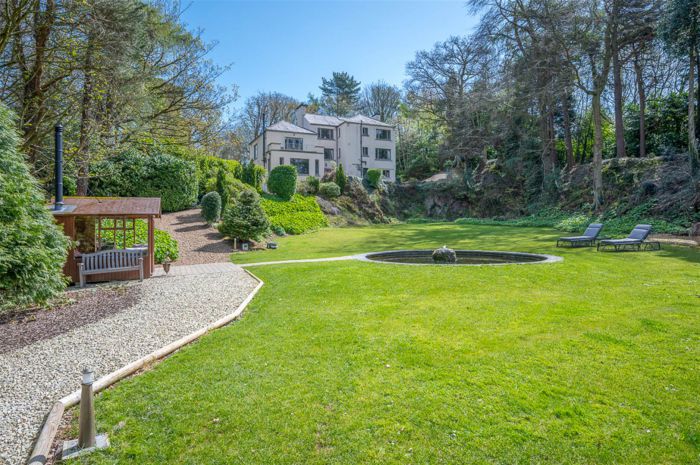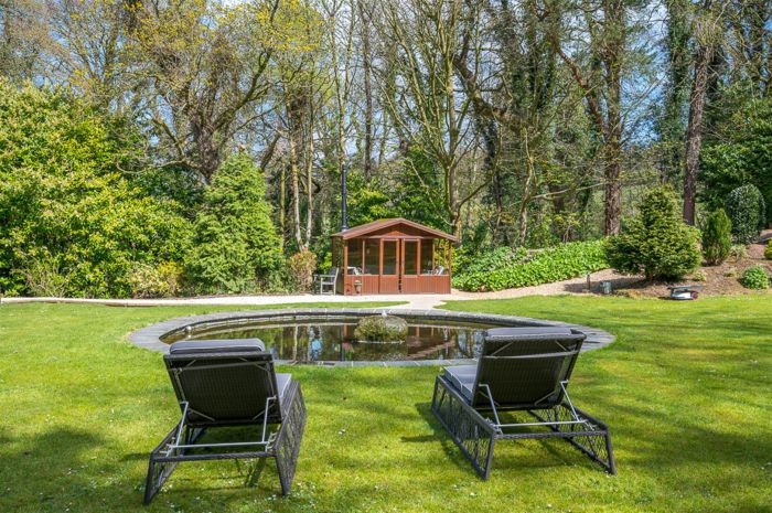 The garden is laid in lawns with a stunning water feature overlooked by a timber garden room with a multi fuel burner