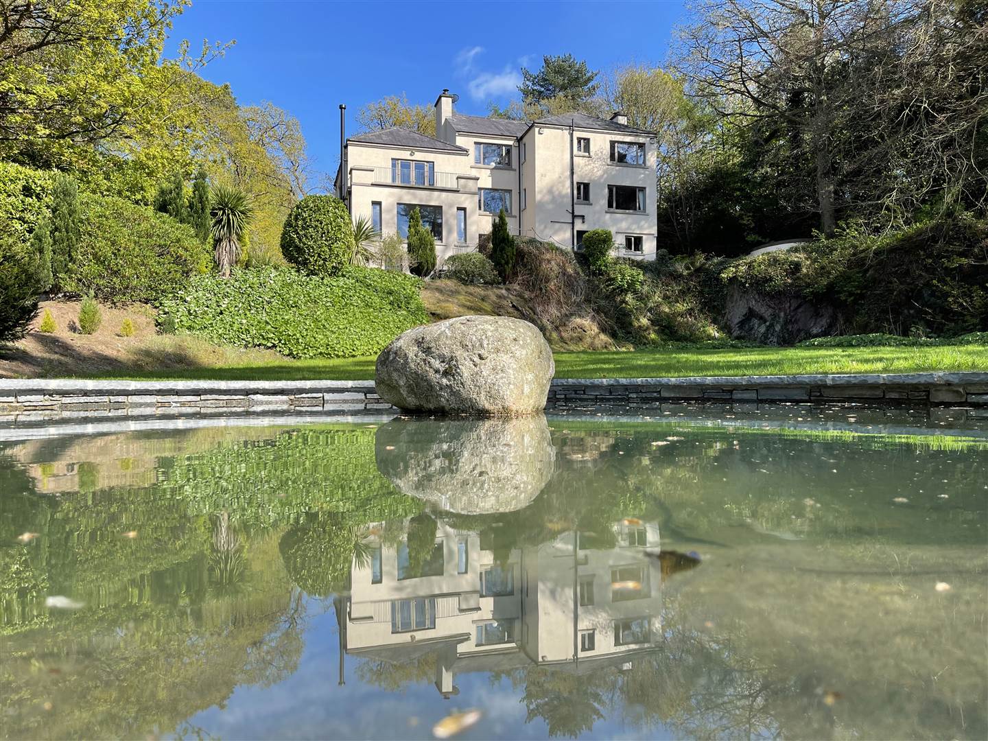 Nature walk with gravel paths leading around the perimeter, natural timber edges, fully lit by solid brass contemporary bollard lights, leading to an Ampitheatre style garden with lawns, exposed rock face, feature central fountain and pond. Exquisite gardens surround the house planted with specimen trees, shrubs, all taking full advantage of the 1 acre site.