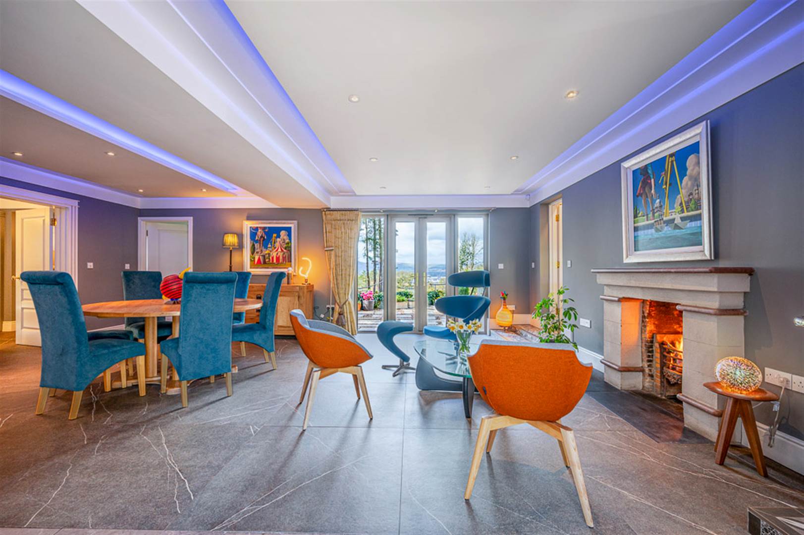 Feature drop ceiling with cornicing, recessed colour LED lights, low voltage lighting, stone fireplace with Armagh marble mantle above, cast iron open fire, slate hearth, underfloor heating, Armagh marble flooring, double glazed French doors and side lights to raised terrace, views to Belfast Harbour, cantilevered staircase with Armagh marble treads and ornate iron handrails and spindles.