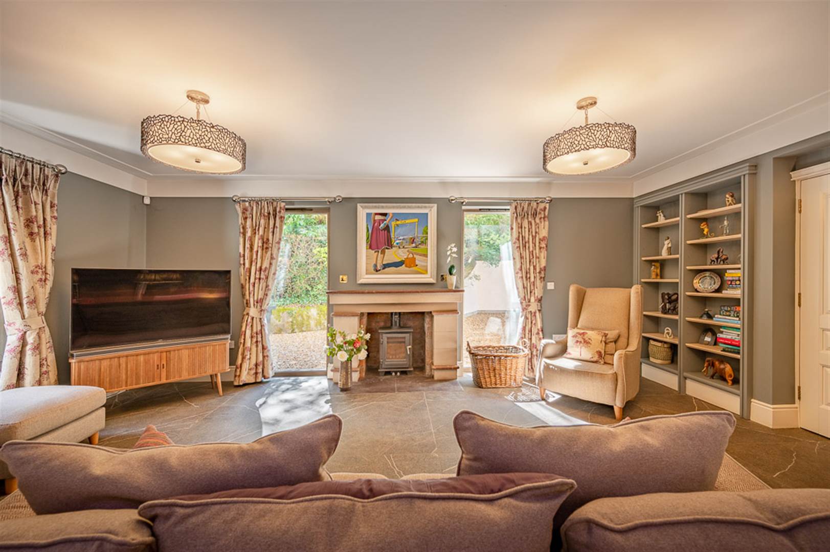 Natural stone fireplace with Armagh marble mantle, slate hearth, cast iron multi fuel burner, underfloor heating, porcelain tiled floor, cornice ceiling, feature panelled bi-folding doors to reception hall, built-in book shelving.