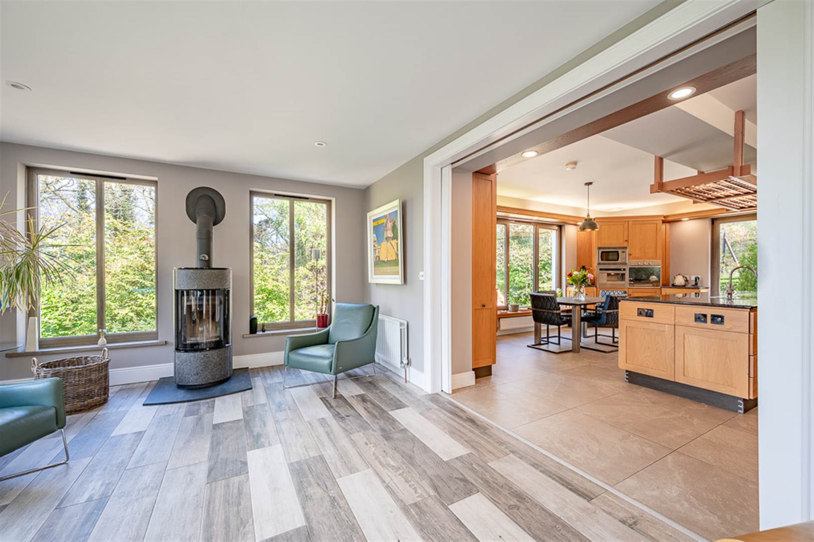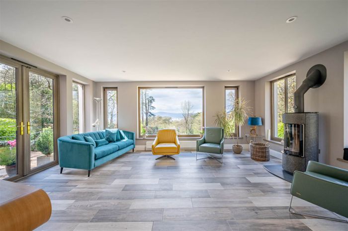 Stunning views from the large picture window with view over the gardens to the countryside and Belfast Harbour offering the perfect spot for a sunset. Max Blank woodburning stove set on a slate hearth, wooden effect tiled floor, French doors to raised patio area, low voltage lighting.