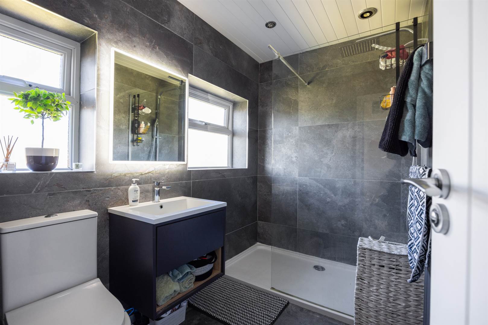 Double shower cubicle with thermostatically controlled shower unit, over drencher and telephone shower, low flush wc, wall mounted sink unit with mixer tap and cupboard below, wall hanging back lit mirror, ceramic tiled floor, fully tiled walls, tongue and groove ceiling, low voltage lighting.