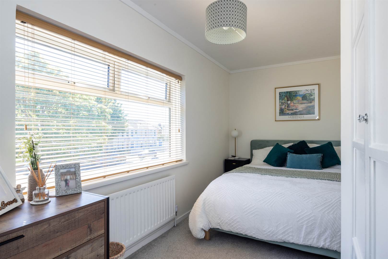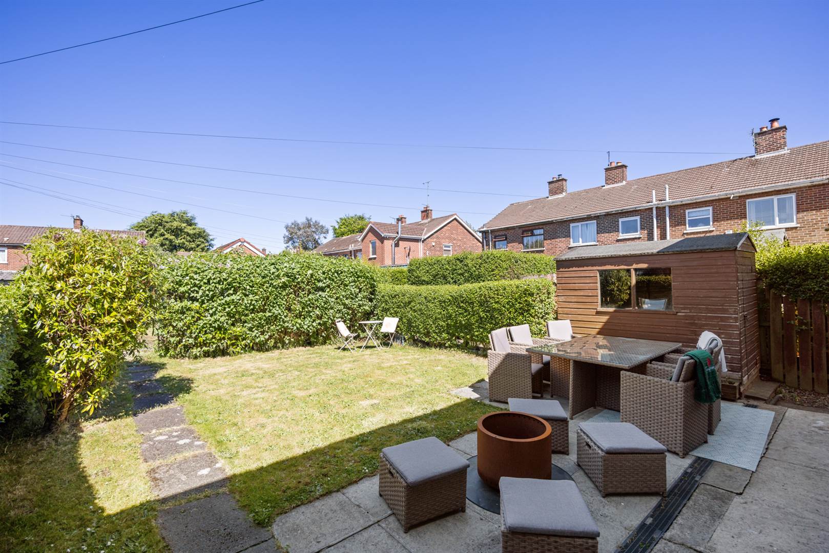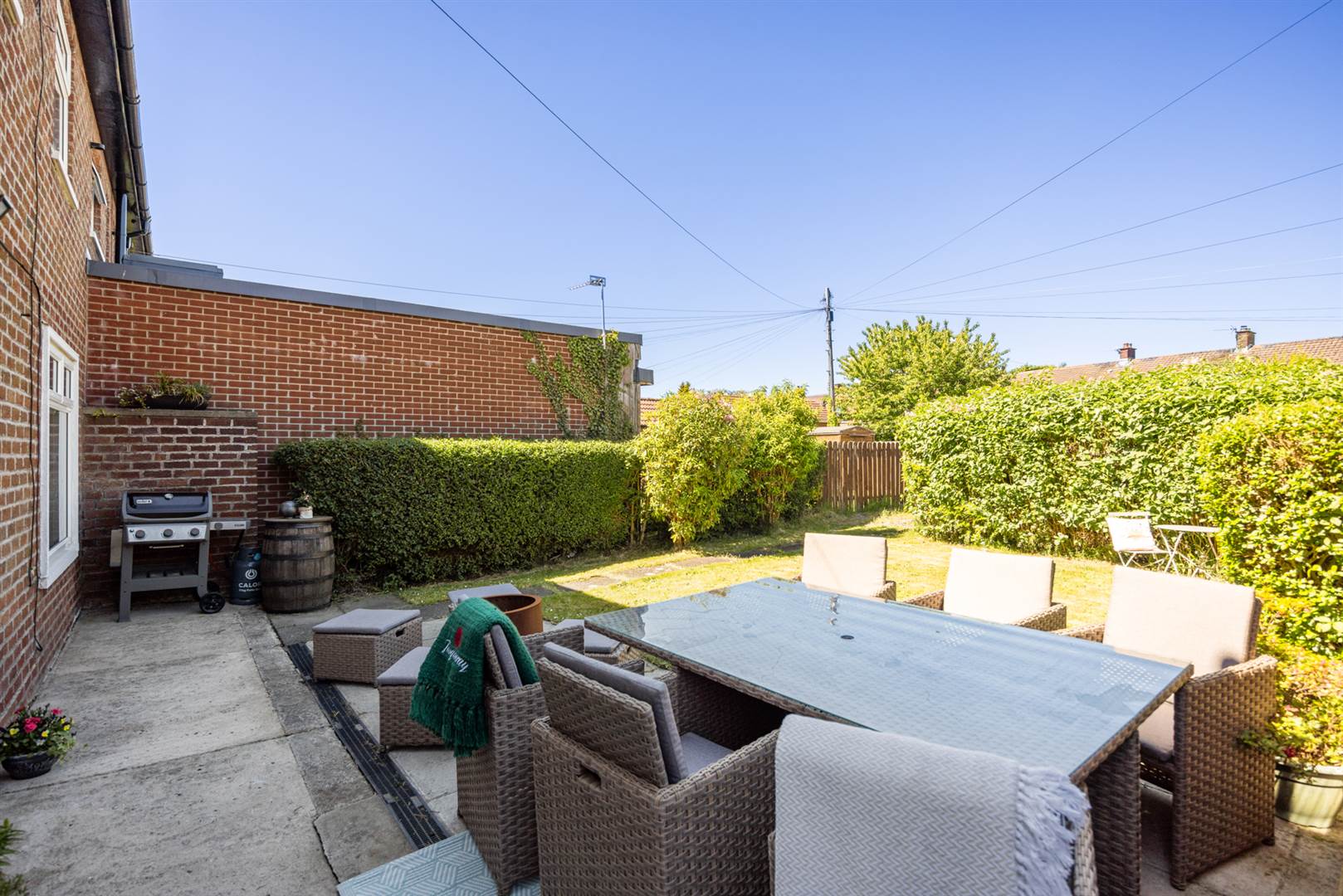 Fully enclosed rear garden laid in lawns, mature shrubs, patio area and path leading to paved driveway.
